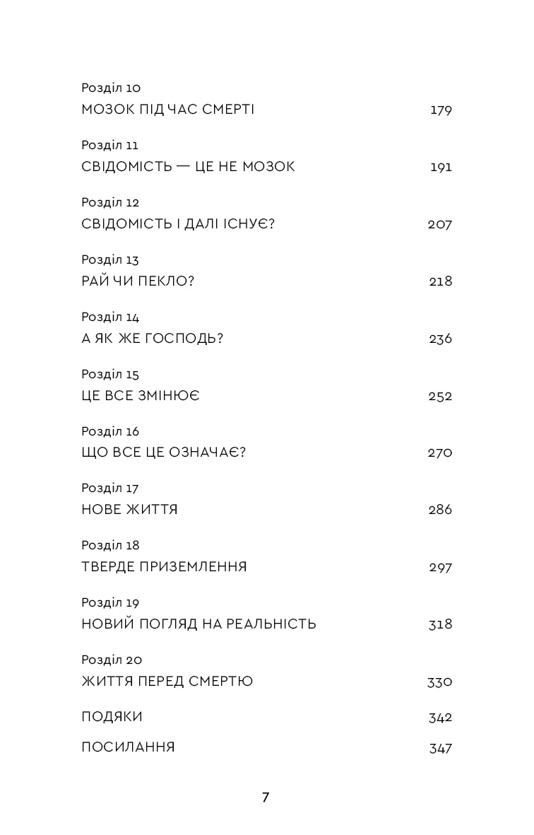 Книга пропонує глибокий аналіз свідомості в моменті переходу між життям і смертю: що бачать пацієнти, які відчуття переживають, і як це змінює їхнє ставлення до життя. Автор не робить категоричних висновків, але пропонує природне пояснення, яке може допомогти зменшити страх смерті.