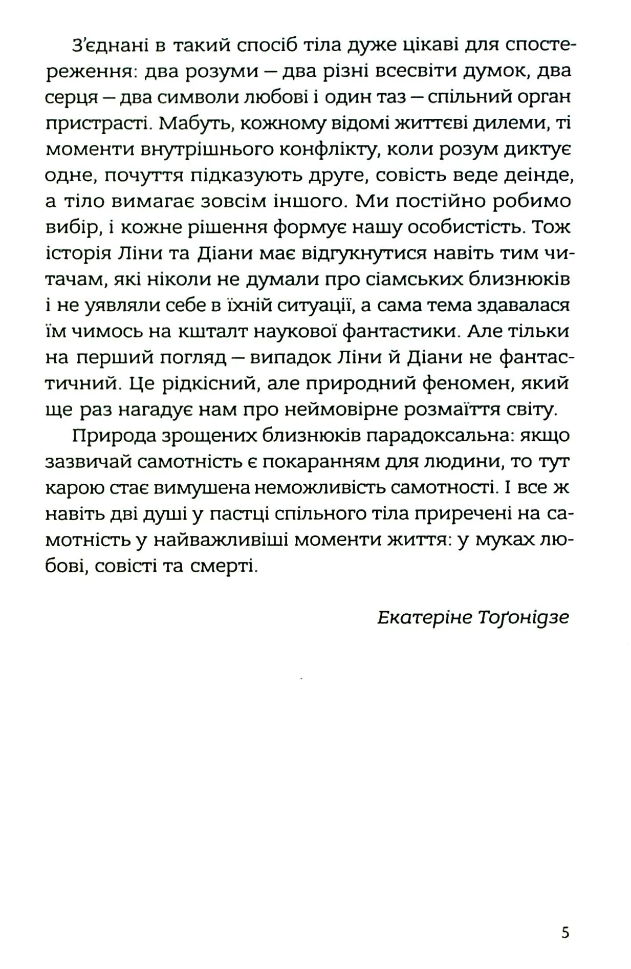 Попри однакові тіла, характери дівчат різні: практична Діана і чуттєва Ліна ніби належать до різних світів. Їхнє життя змінюється після смерті бабусі й нищівної повені. Після трагічних подій дівчата потрапляють до цирку, де змушені виступати в шоу, втративши волю. Авторка темно, але щиро зображає дискримінацію людей з обмеженими фізичними можливостями, жорстокість суспільства і хистке поняття свободи.