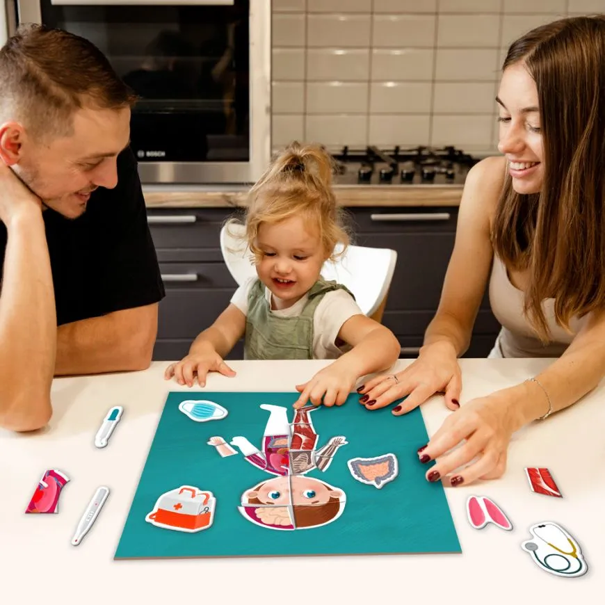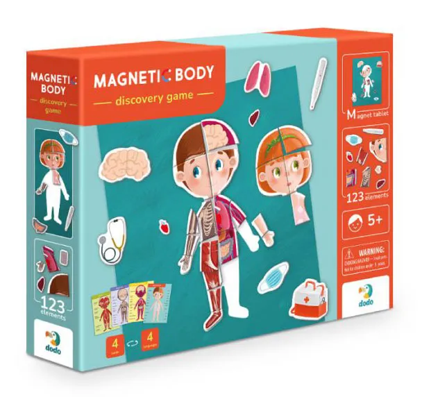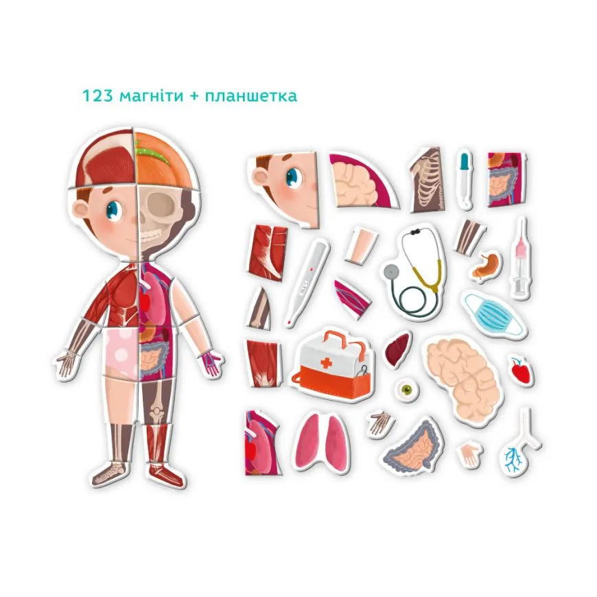 Час дізнатися більше про тіло людини! Вивчаємо будову скелету, назви внутрішніх органів та м’язів з магнітною грою. У наборі: магнітна планшетка з обрисом тіла людини та 123 елементи, на яких можна вивчати будову тіла. Малюки можуть накладати магніти один на одного, вчити нові слова.