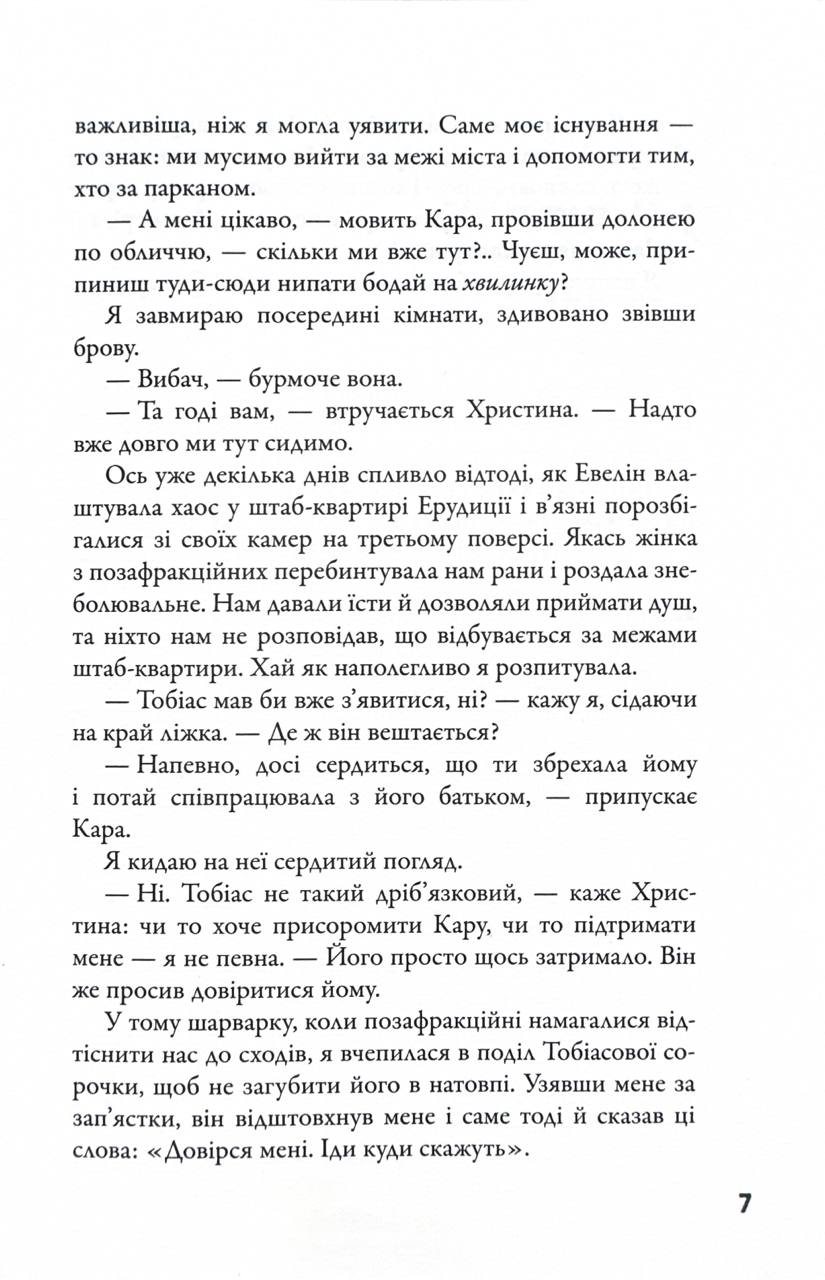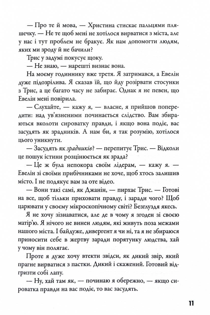 Події книги продовжують тематику боротьби за ідентичність та свободу вибору. У новому світі Трис стикається з викликами, які змушують її переосмислити поняття добра і зла. Вона повинна обирати між особистим щастям і загальним благом, між відданістю близьким і правдою, яка може зруйнувати все.