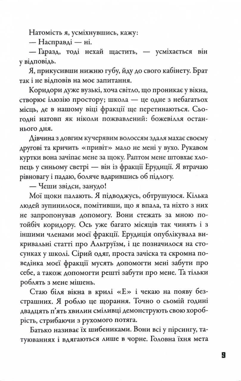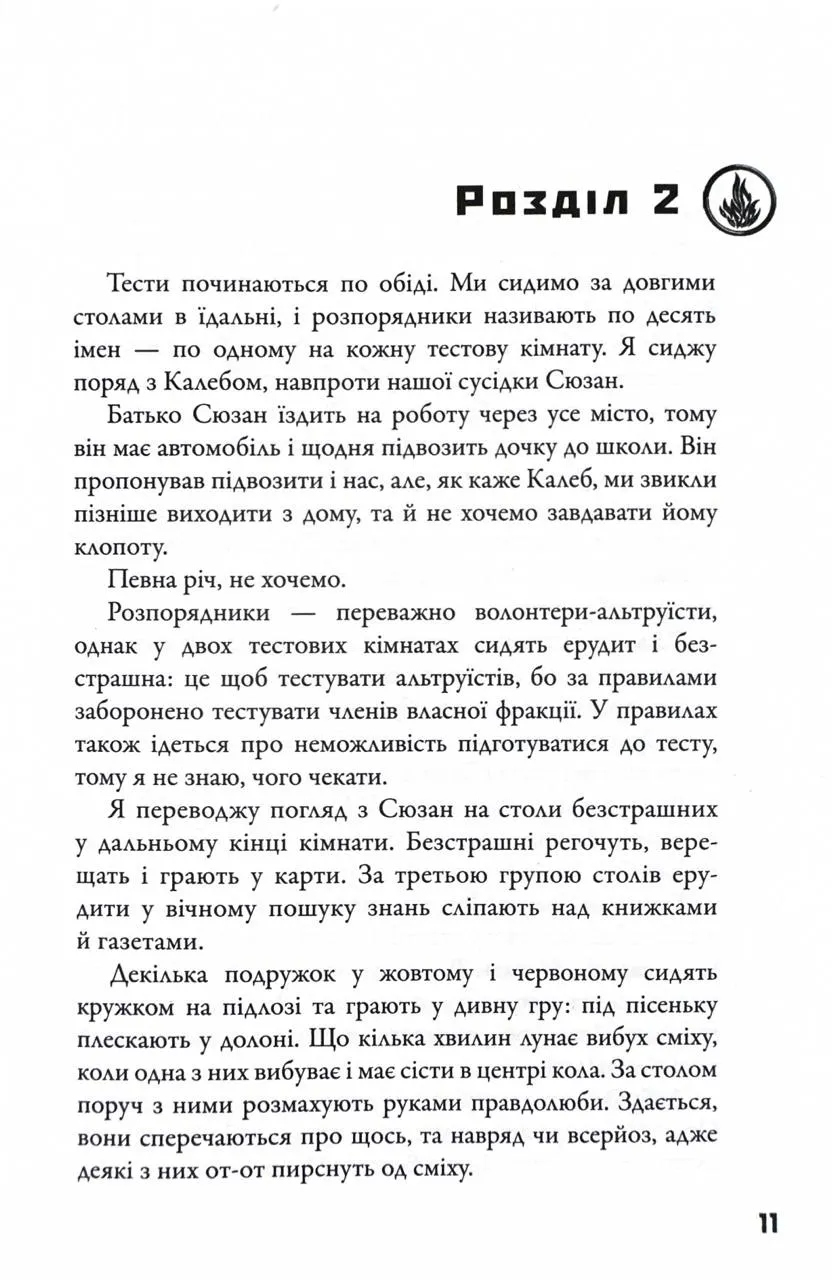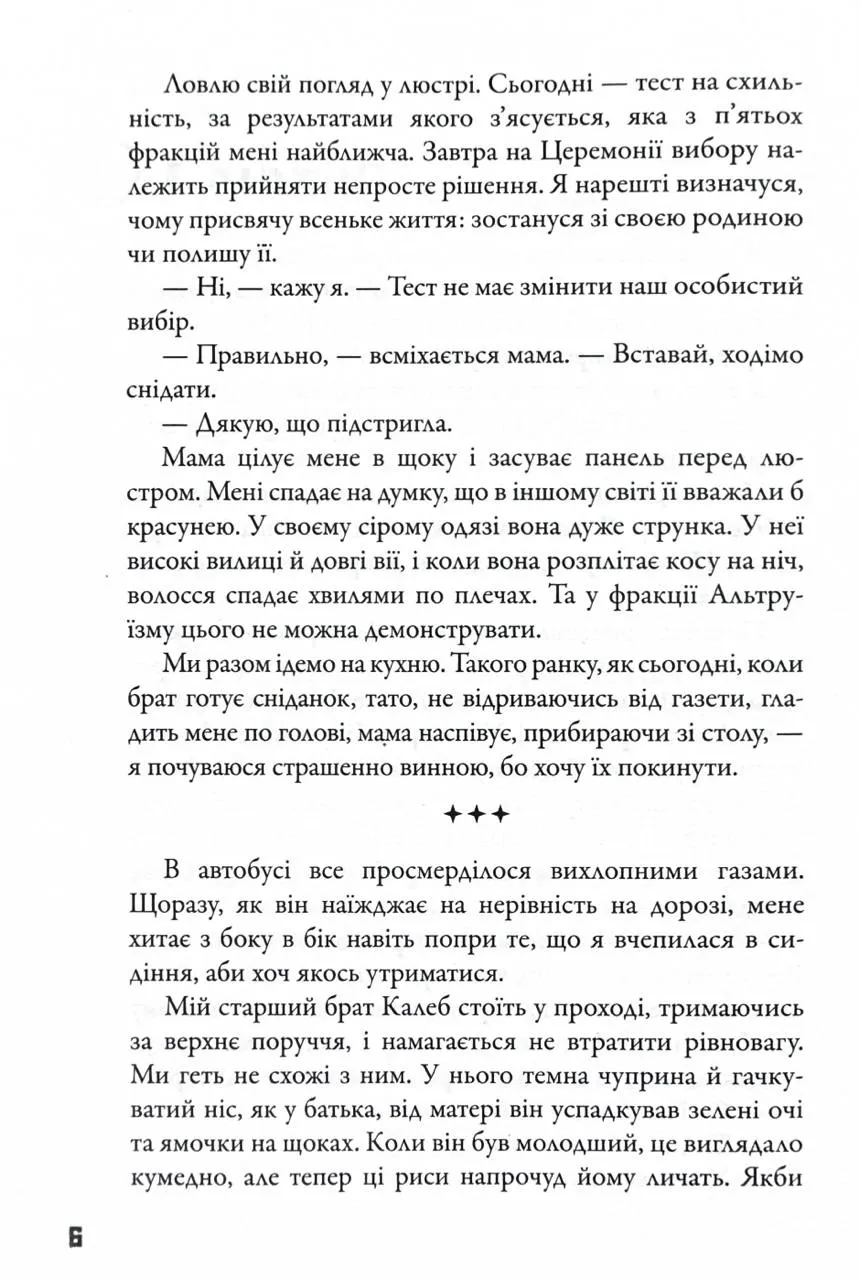 Головна героїня, шістнадцятирічна Беатрис Прайор, опиняється перед непростим вибором, адже результати її тесту показують, що вона — дивергент. Це означає, що вона не належить лише до однієї фракції. В реальності, у якій владу хочуть контролювати через єдину правду, дивергенти становлять загрозу. Авторка майстерно описує боротьбу героїні за свободу думки та внутрішню незалежність, що робить книгу глибокою та емоційною.