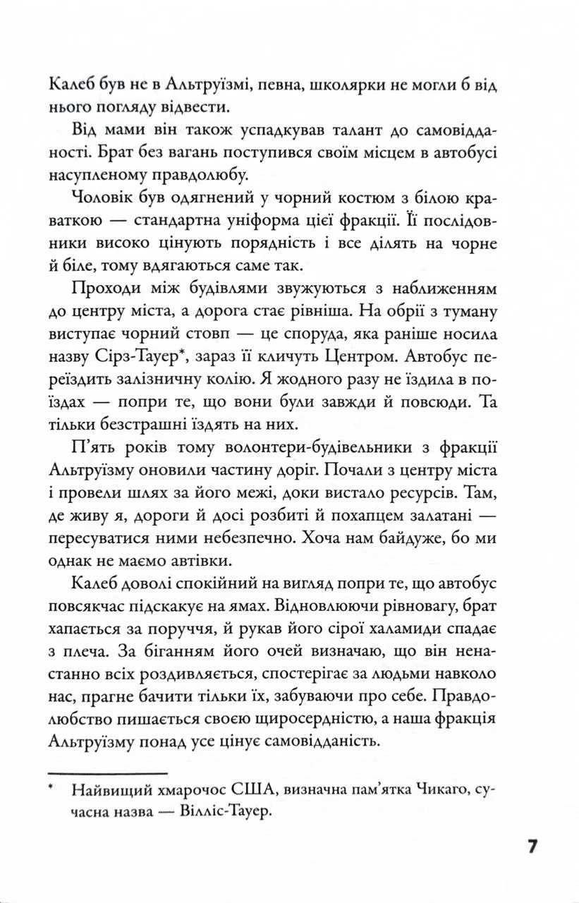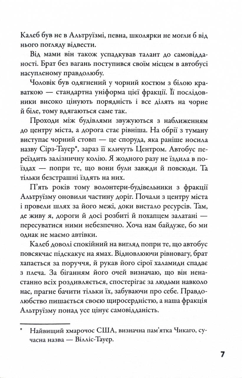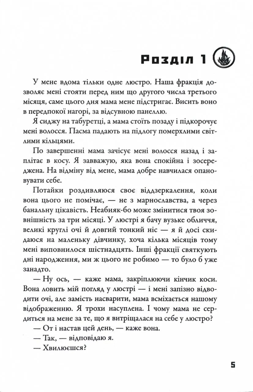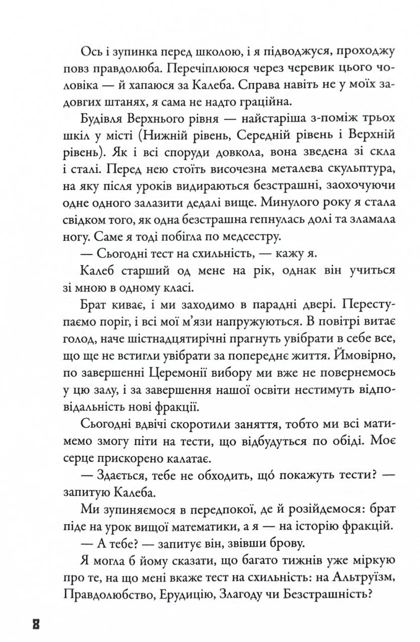 Головна героїня, шістнадцятирічна Беатрис Прайор, опиняється перед непростим вибором, адже результати її тесту показують, що вона — дивергент. Це означає, що вона не належить лише до однієї фракції. В реальності, у якій владу хочуть контролювати через єдину правду, дивергенти становлять загрозу. Авторка майстерно описує боротьбу героїні за свободу думки та внутрішню незалежність, що робить книгу глибокою та емоційною.