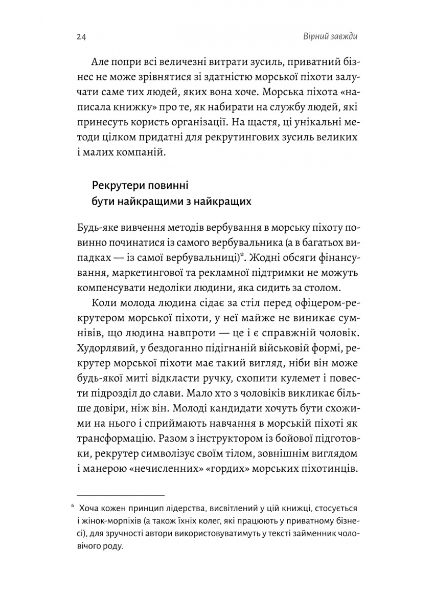 Книга Вірний завжди. Бізнес-лідерство на принципах морської піхоти авторів Дена Керрісона та Рода Волша — це практичний посібник для управлінців, які шукають ефективні підходи до лідерства. Вона пропонує унікальний погляд на бізнес-керівництво крізь призму воєнного досвіду та дисципліни Корпусу морської піхоти США.