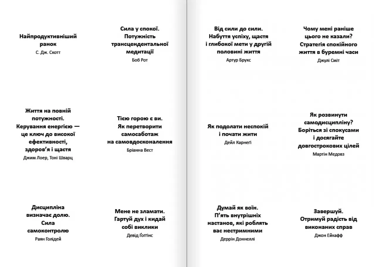 Книга включає самарі до популярних світових бестселерів з тем самодисципліни, розвитку сили волі, управління емоціями та збереження енергії. Особливістю видання є наявність аудіоверсії, завдяки чому ви можете надихатися і розвиватися навіть у дорозі чи під час тренування.