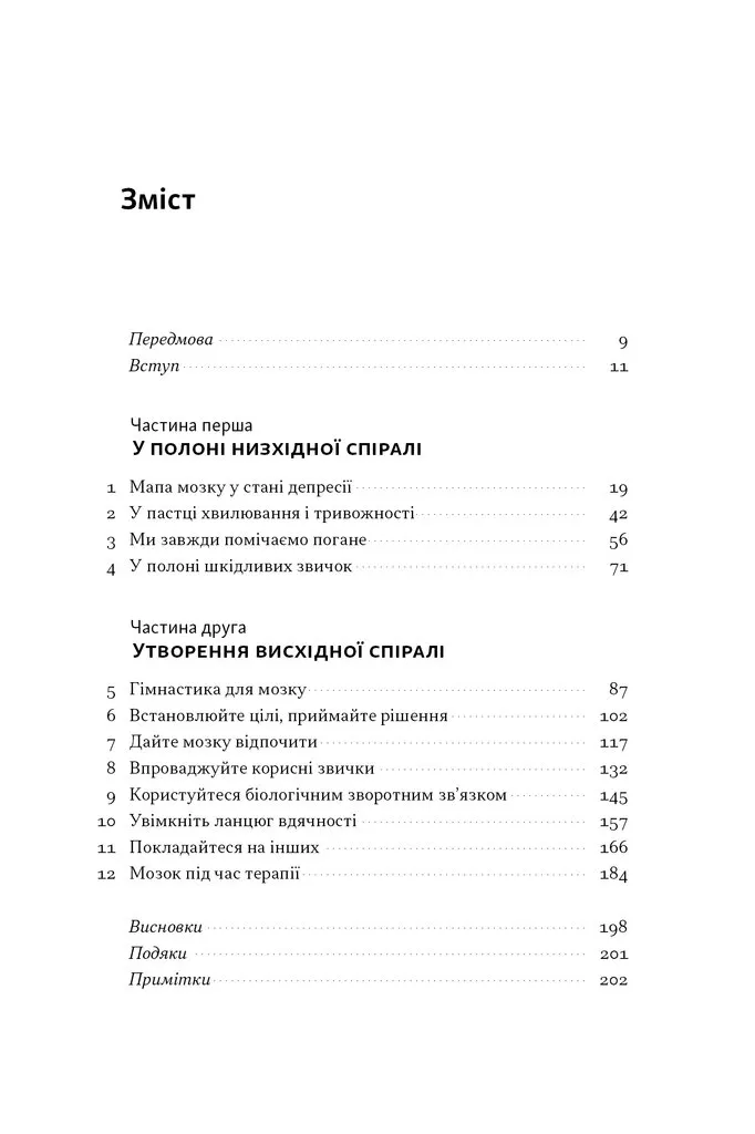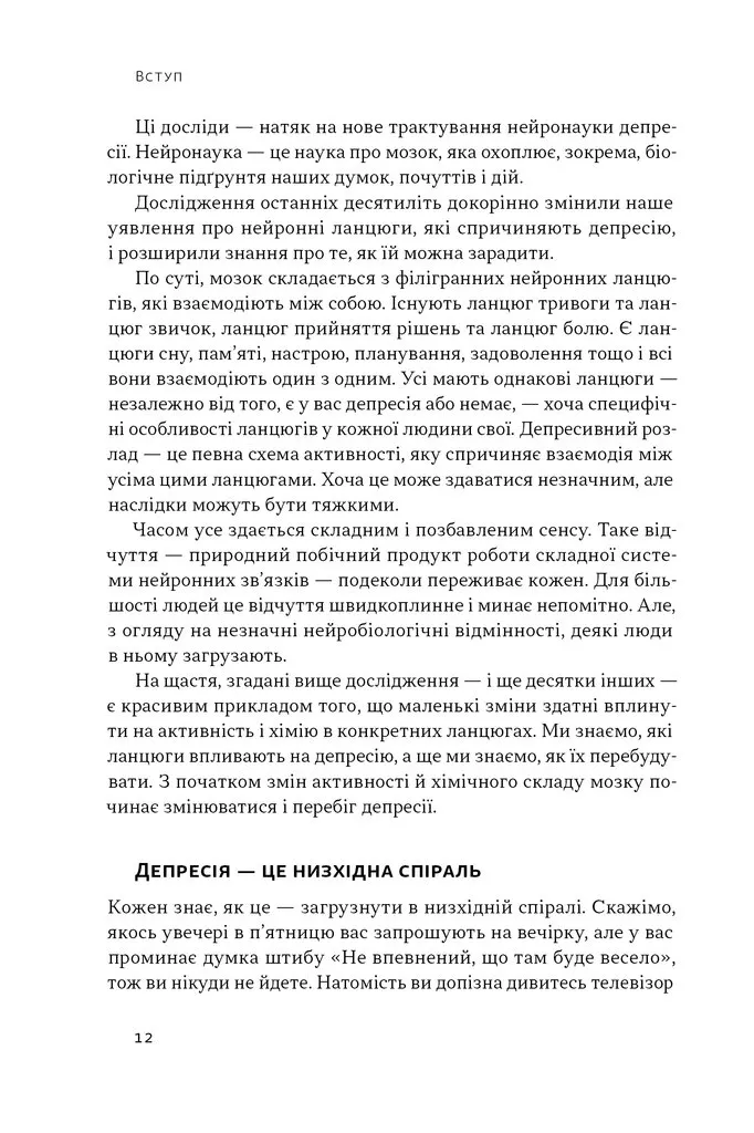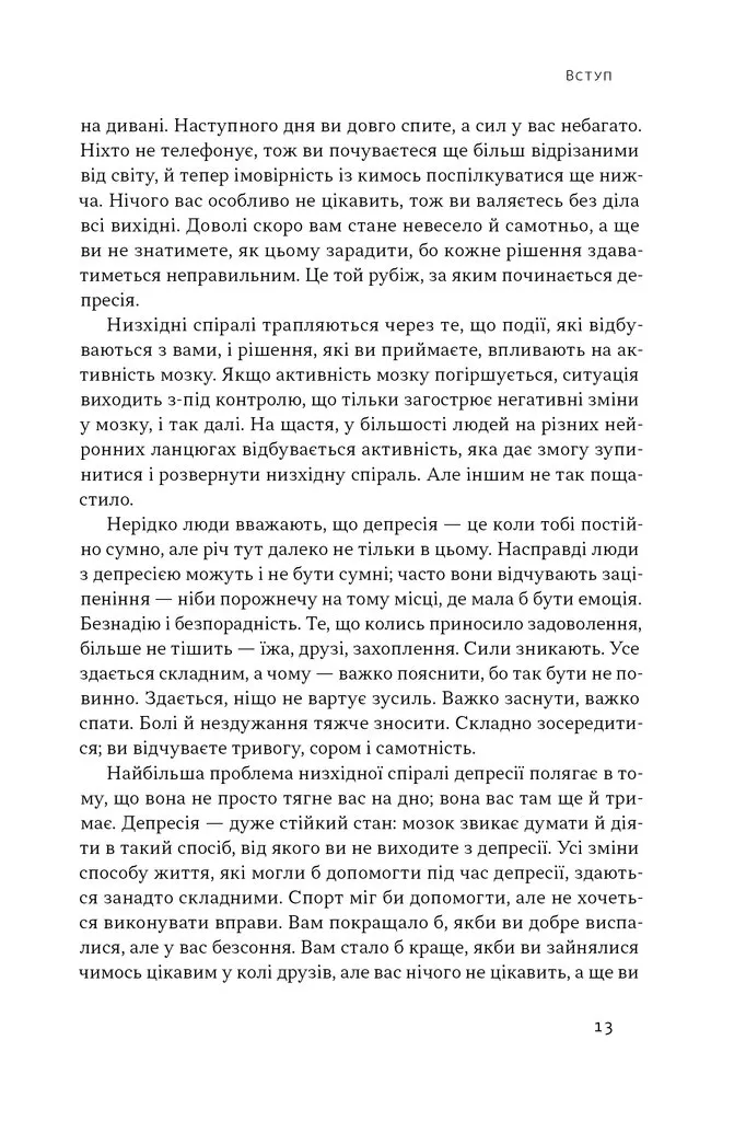Головна ідея книги — рух вгору можливо почати з найдрібніших кроків. Регулярна фізична активність, глибоке дихання, навіть щоденна соціалізація здатні змінити ваше самопочуття на краще, впливаючи на активність нейронних ланцюгів.