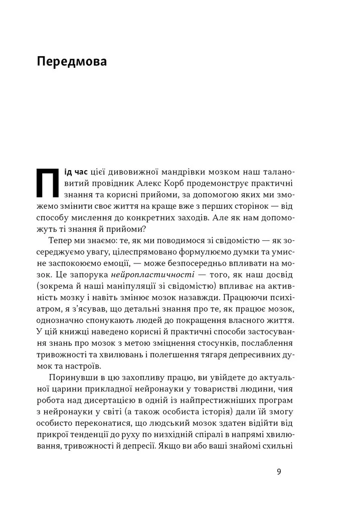 Алекс Корб — доктор філософії в галузі нейронауки, викладач та популяризатор знань про функціонування мозку. Його дослідницька діяльність та практичні поради допомагають тисячам людей змінити своє життя на краще.