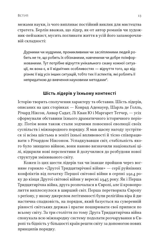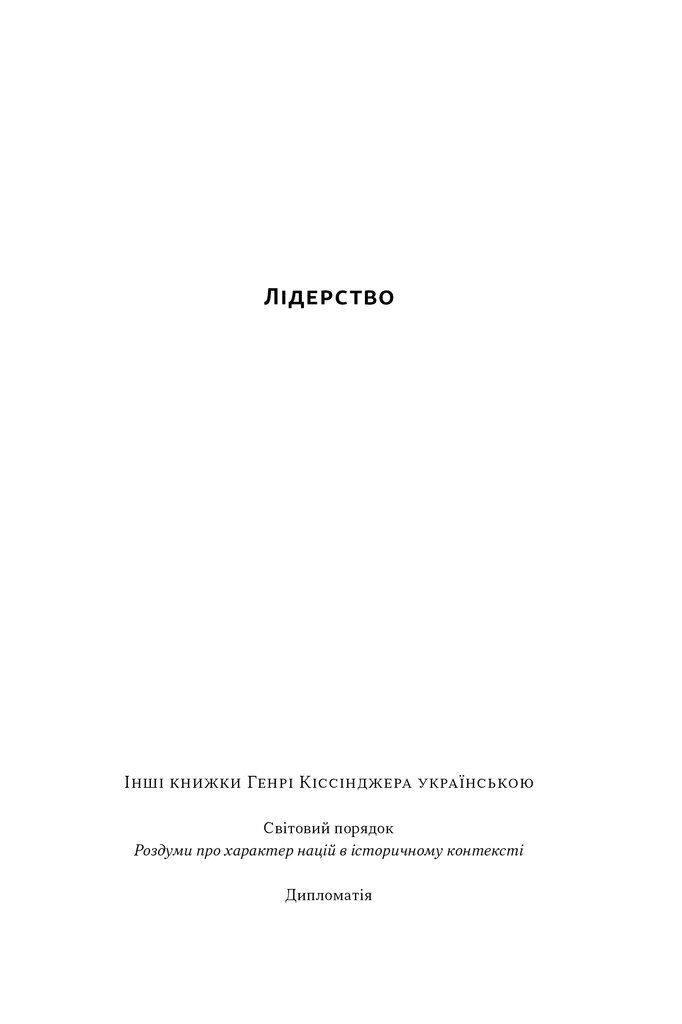 На ці запитання відповідали протягом свого життя і шість знаменитих лідерів, яких змальовує Генрі Кіссінджер у книжці «Лідерство» — Конрад Аденауер, Шарль де Голль, Річард Ніксон, Анвар Садат, Лі Куан Ю і Маргарет Тетчер. Видатний автор аналізує стратегії, реалізовані цими державними діячами, і оцінює їхні успіхи та невдачі, які становлять цінний досвід для лідерів сучасності й прийдешніх поколінь.