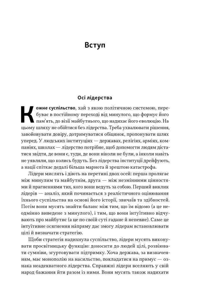 Складні часи потребують сміливих, але водночас і зважених дій. У моменти, коли країна стикається з небаченими досі викликами, різко зростає роль лідерів, які готові брати на себе відповідальність і вчасно ухвалювати потрібні, нехай навіть непопулярні, рішення. Перед лідерами постає безліч запитань, які потребують відповідей: у чому джерела суспільного добробуту й занепаду? Яку спадщину потрібно зберегти, а яку — пристосувати до поточних обставин чи навіть відкинути? Яким цілям варто присвятити себе, а від яких слід відмовитися?