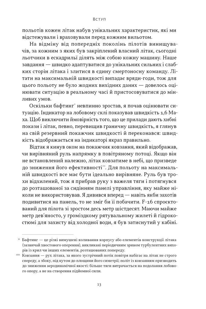 У цій книжці пілот F-16 і F-35 ділиться бойовим досвідом, вчить гартувати власну стійкість в екстремальних умовах, розповідає про три степеневі закони, розкриває принципи успішності операцій — від якісного оцінювання до аналізу проведених дій.