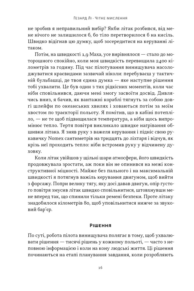 Книжка Гезарда Лі — про мислення, яке забезпечує ефективність на висоті 15 тисяч метрів і швидкості понад 1500 кілометрів за годину. Вона стане у пригоді тим, хто щоденно ухвалює складні рішення, хоче чітко розставляти пріоритети, розвиває власну рішучість і швидкодію, цікавиться авіацією. Рекомендована до вивчення військовим.