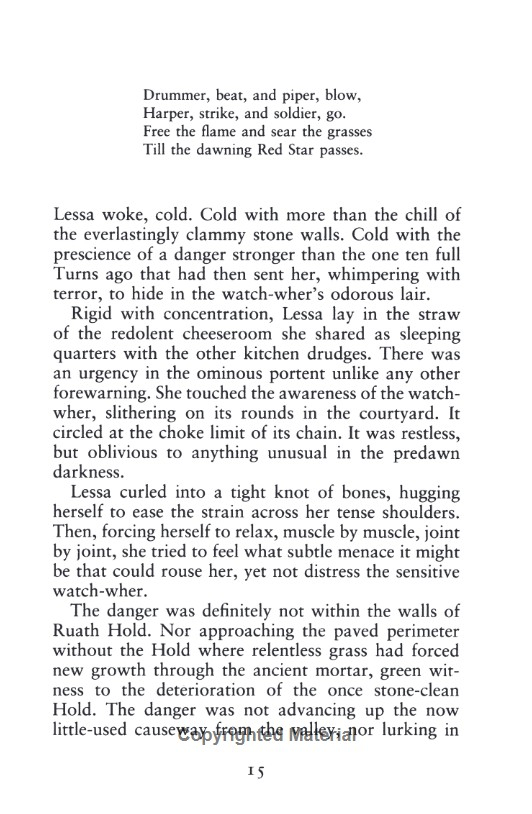 На прекрасному світі під назвою Перн Лесса — вигнанка і єдина, хто вижив: її батьків убито, спадок викрадено. Вона — відважна молода жінка, яка ніколи не переставала мріяти про помсту. Аж поки амбітний вершник дракона Ф’лар не пропонує їй дещо більше: шанс стати лідеркою Перну, осідлавши золоту дракониху, з якою її поєднає телепатичний зв’язок, глибший за будь-який людський. Хоча є ще й її напружені стосунки з самим Ф’ларом.