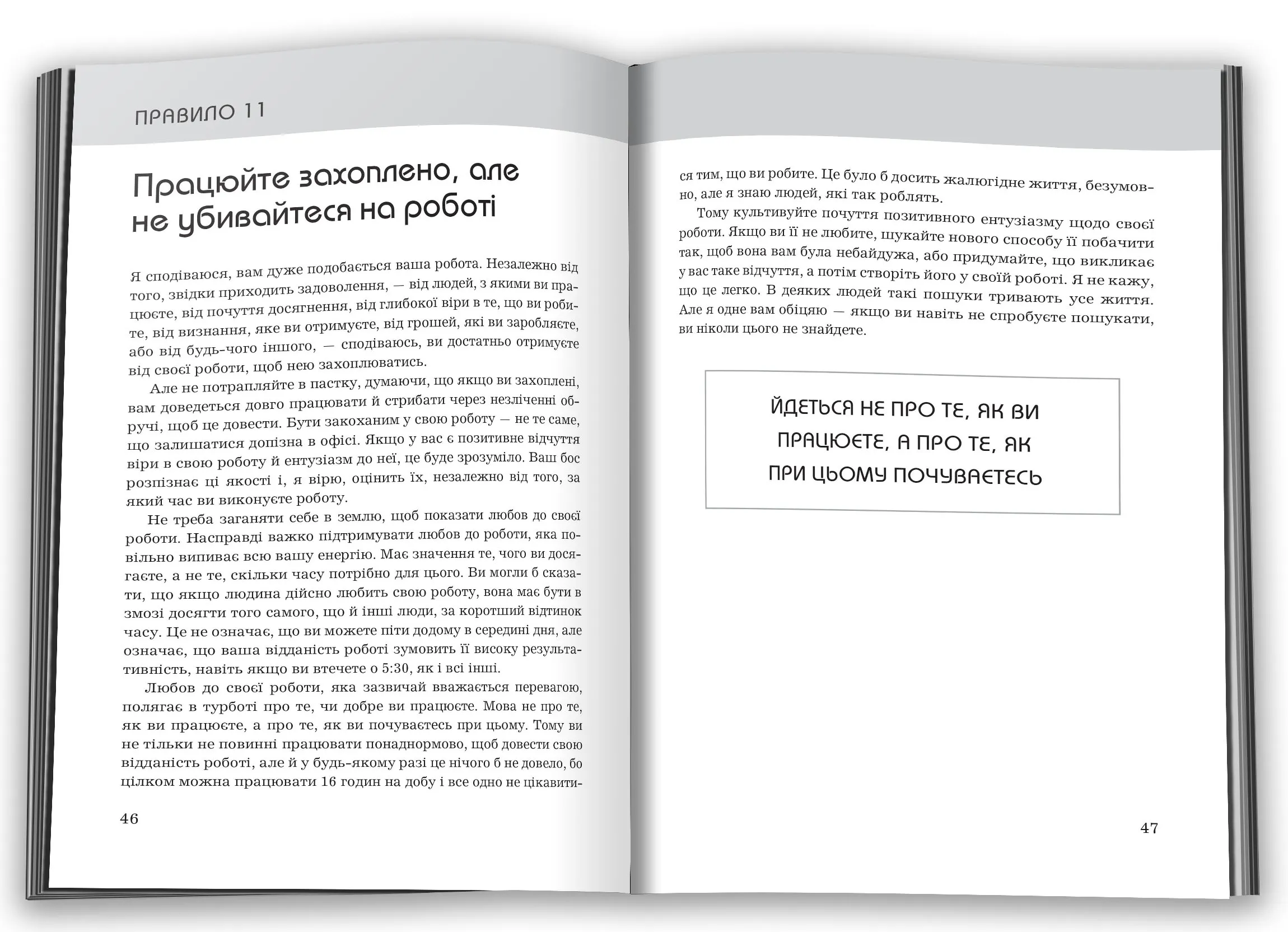 Правила кар'єри — це результат багаторічного досвіду та аналітики соціальної поведінки на роботі. Автор докладно описує 100 золотих правил, які допоможуть не тільки вдосконалити навички, а й підійти до роботи з іншим світоглядом. Вже понад рік книга лишається в топі продажів у категорії літератури з особистісного зростання, підтверджуючи свою ефективність у реальному житті.