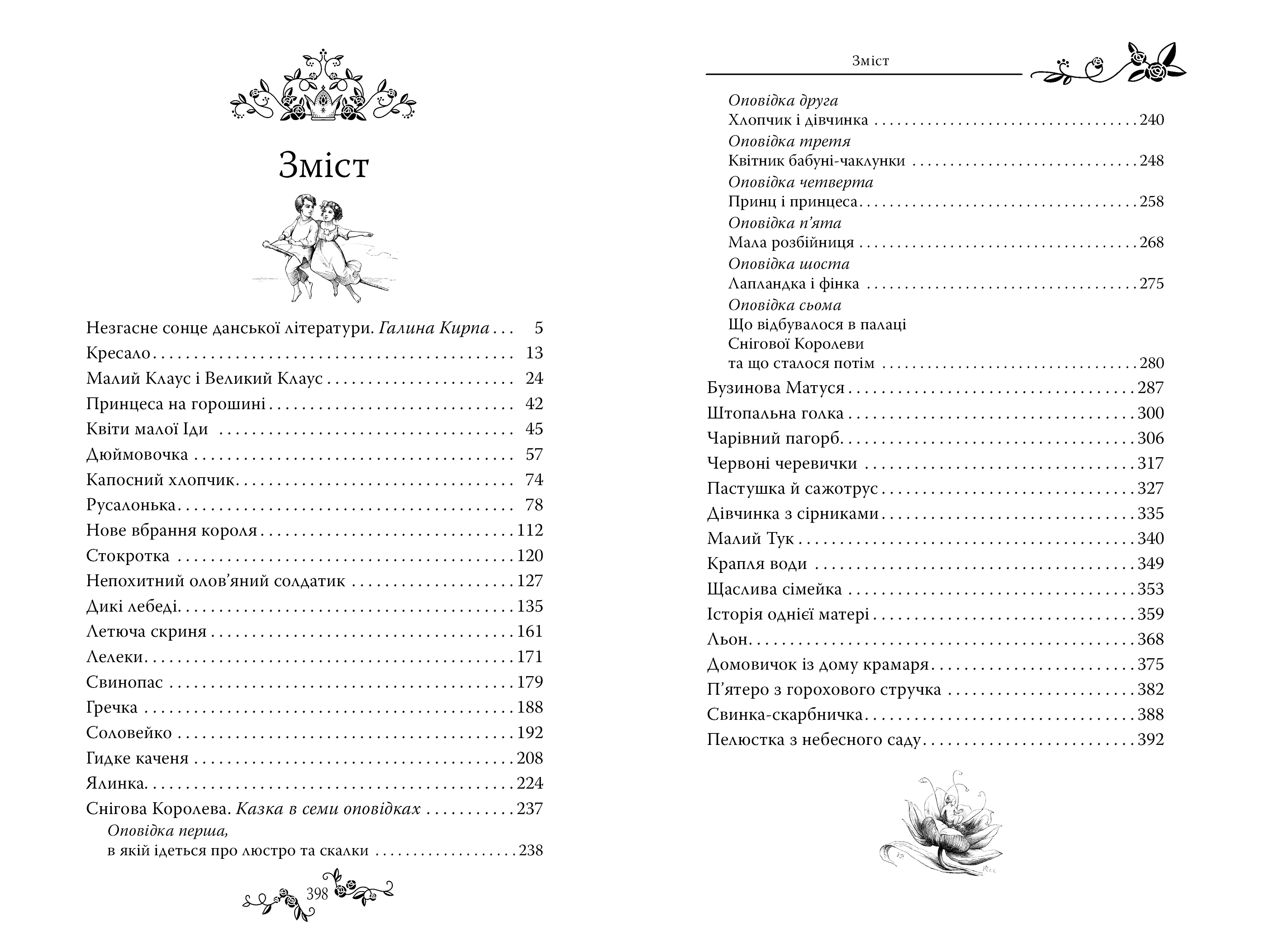 - Збірка містить такі хрестоматійні твори, як Русалонька, Дівчинка з сірниками, Гидке каченя, Снігова королева та інші.