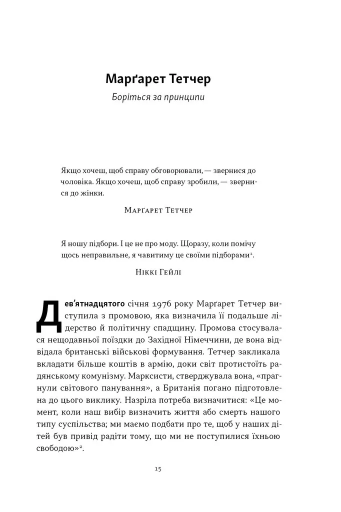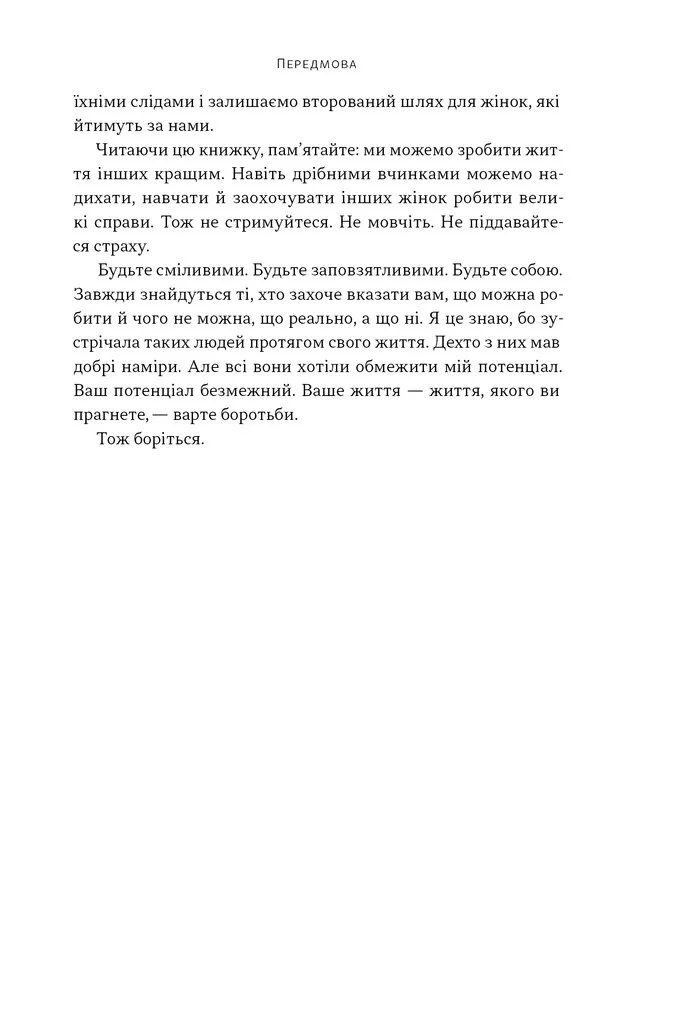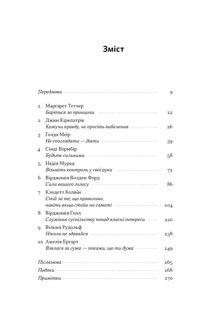 У центрі уваги — прем’єр-міністерки, борчині за права людини, спортсменки, журналістки, пілотеси та навіть шпигунки. Серед них — Маргарет Тетчер, Надія Мурад, Амелія Ергарт і Клодетт Колвін. Кожна героїня книги — символ сили, прагнення до справедливості й рішучості. Вони діяли в умовах, що вимагали надзусиль, і не злякалися бути першими, хто зробив крок уперед.