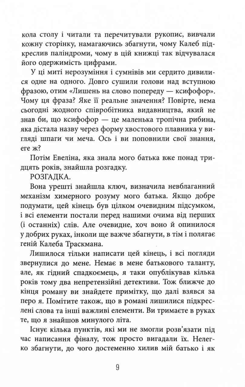 Леані доведеться пройти складний шлях пошуку відповідей: що трапилось тієї ночі? Чи пов’язані ці випадки між собою? Яке значення має незавершений рукопис, який залишив Калеб Траскман? Роман наповнений лихими віражами, психологічною напругою й майстерно вписаними деталями, що зачіпають найглибші відчуття читача.