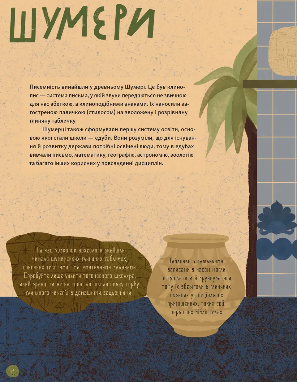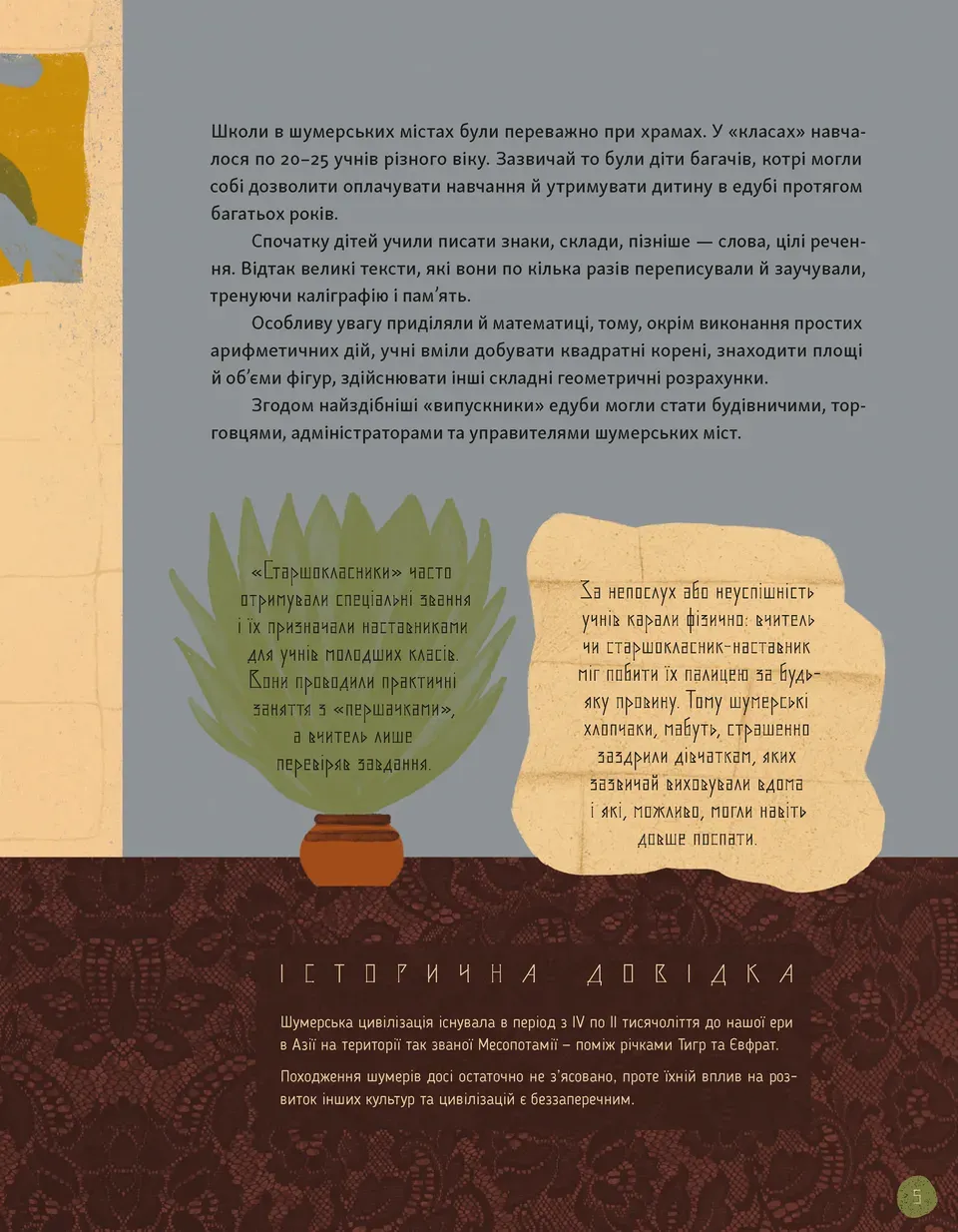 Навчання у давні часи було справжнім випробуванням. Діти писали на глиняних табличках, проводили цілі дні в школах, і навіть мали справу з доволі суворими карами за помилки. У своїй книжці Бачинський розповідає про: