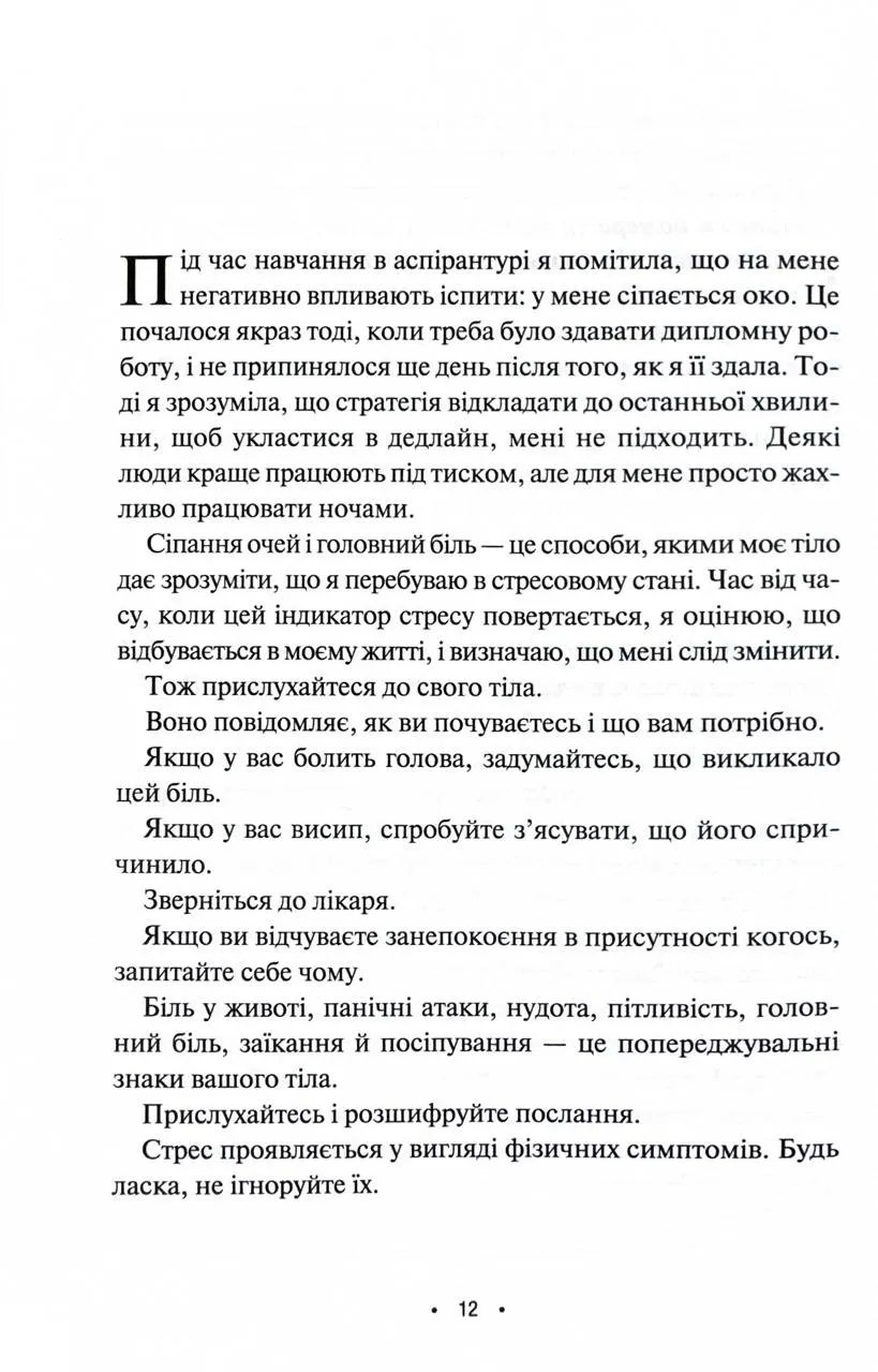 Кожна сторінка книги запрошує до роздумів. Авторка закликає звертати увагу на речі, які ми можемо контролювати всередині себе — емоції, реакції, внутрішні установки. Замість того, щоб боротися зі світом, вона пропонує налаштуватися на гармонію з собою. Тема зниження тривоги, встановлення особистих меж та уникнення емоційної драми є наскрізною і надзвичайно актуальною для багатьох.