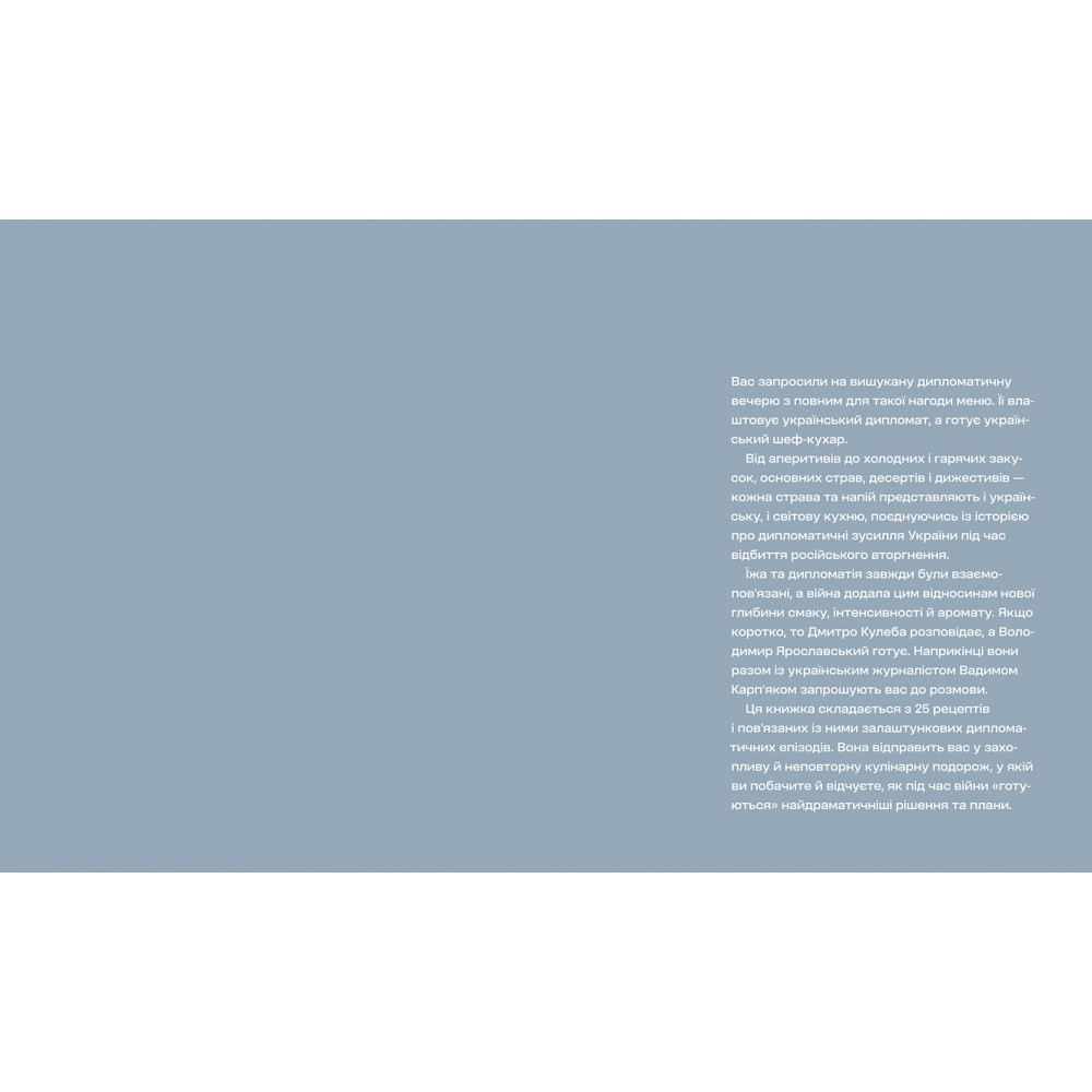 Це вишукана подорож кулінарною дипломатією. Дмитро Кулеба, міністр закордонних справ України, ділиться історіями про міжнародні ініціативи в умовах війни, а шеф-кухар Володимир Ярославський пропонує 25 вишуканих рецептів, які втілюють дух української і світової кухні.