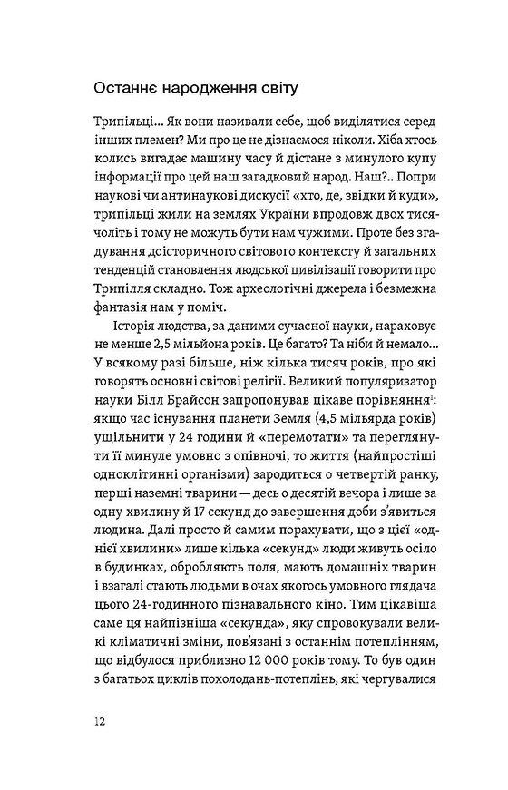 Історик та директор археологічного заповідника Трипільська культура Владислав Чабанюк у своїй праці відповідає на десятки запитань, які могли б виникнути у кожного, хто цікавиться історією: ким були трипільці, як вони називали себе, як виглядало їхнє життя тисячі років тому. Особливу увагу автор приділяє побуту, архітектурі, моді та ролі суспільства в процесах розвитку культури.