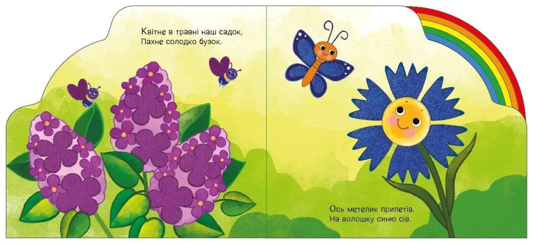 У книзі зручно поєднано візуальне навчання та сенсорний досвід. Малюк дізнається про базові кольори, назви тваринок і рослин, а також розвиватиме мовлення та логіку.