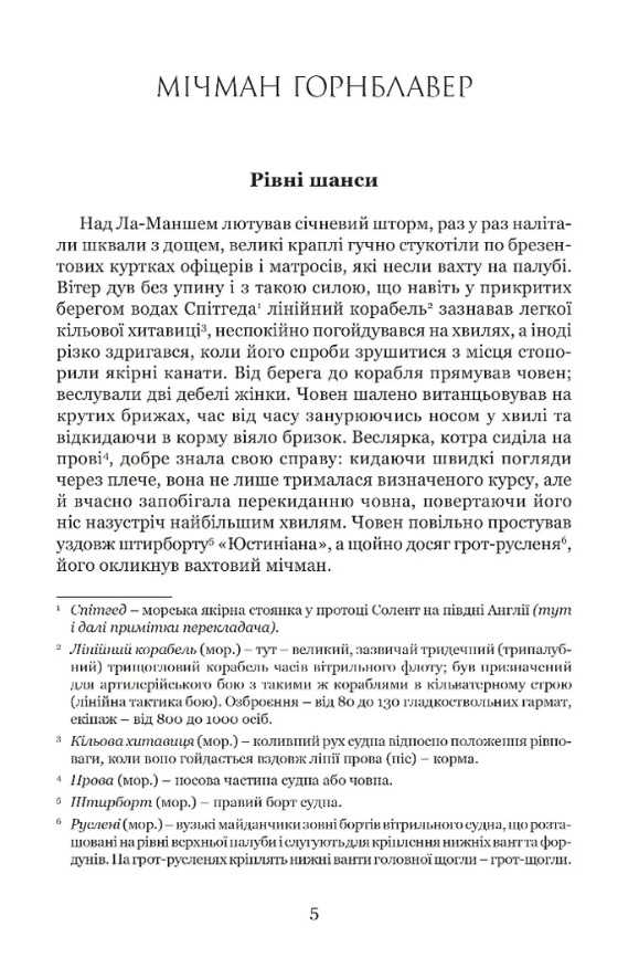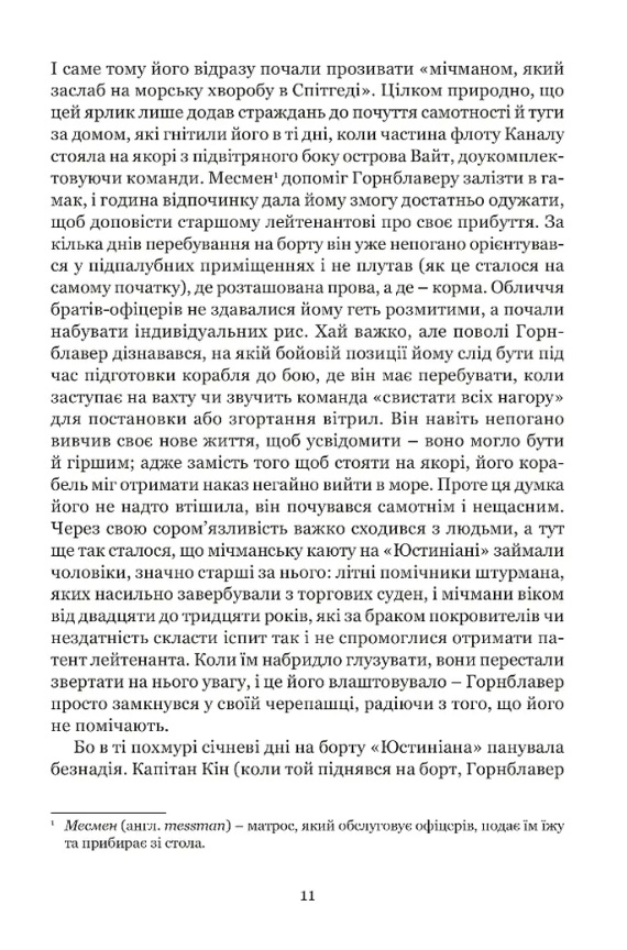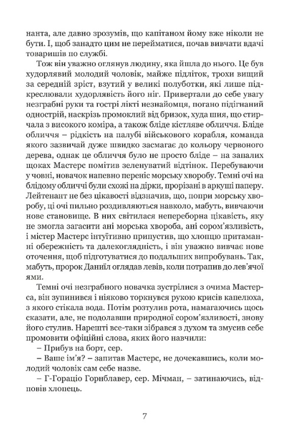 У центрі сюжету — юний мічман Горнблавер, що тільки розпочинає службу на кораблі. Його перше плавання, непереборний страх, бойове хрещення та перші перемоги роблять кожен розділ насиченим подіями. Читач стане свідком формування героя, міцного характером та відданого своїй справі.