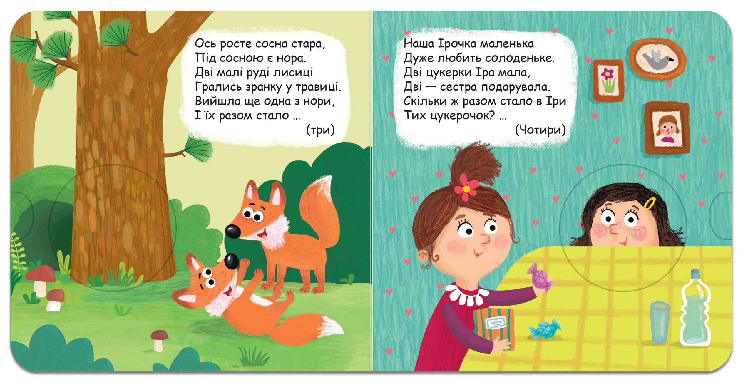 Книжечка допоможе дітям 2+ вивчити цифри від 1 до 10. Тут можна прочитати віршики-загадки про малят та звірят, порахувати, скільки предметів або тварин було названо, а потім подивитися правильну відповідь, висунувши прихований елемент із цифрою-відгадкою.