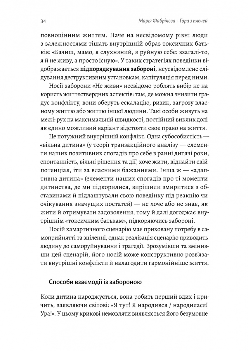 Книга Гора з плечей. Як виявити і подолати 13 психологічних заборон стала однією з найпомітніших новинок серед психологічної літератури 2024–2025 років. Її авторка — досвідчена психотерапевтка та письменниця Марія Фабрічева, яка десятиліттями працює в напрямку транзакційного аналізу та допомоги людям у подоланні внутрішніх обмежуючих переконань.