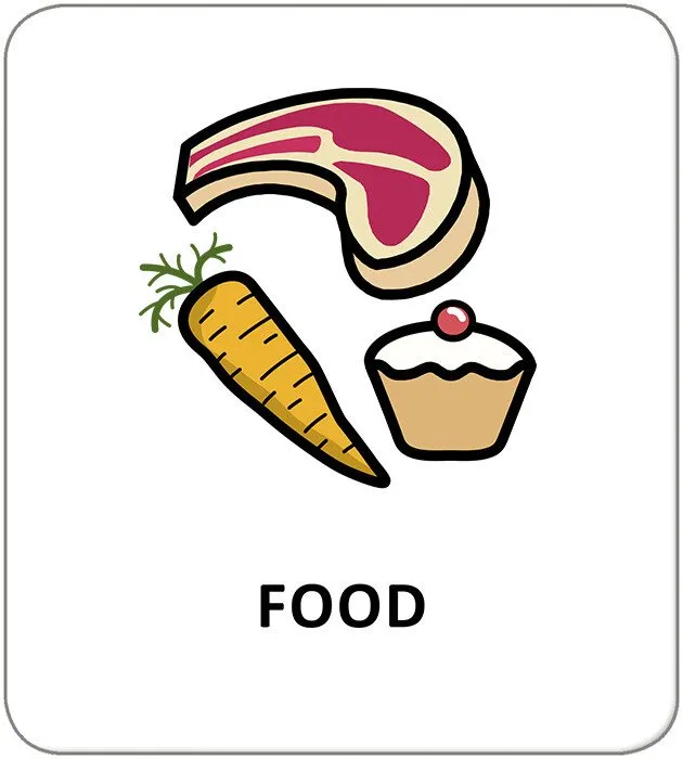Картки з піктограмами: Їжа, напої адаптовані з урахуванням вікових й індивідуальних потреб дитини. Вони зручні у використанні та не перевантажені інформацією, завдяки чому діти легко фокусуються на кожному елементі.