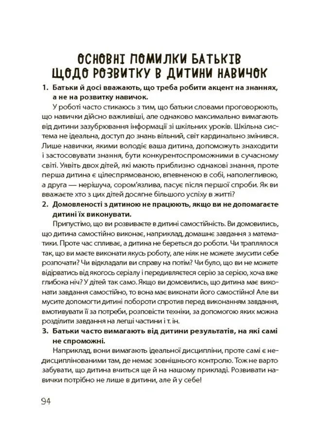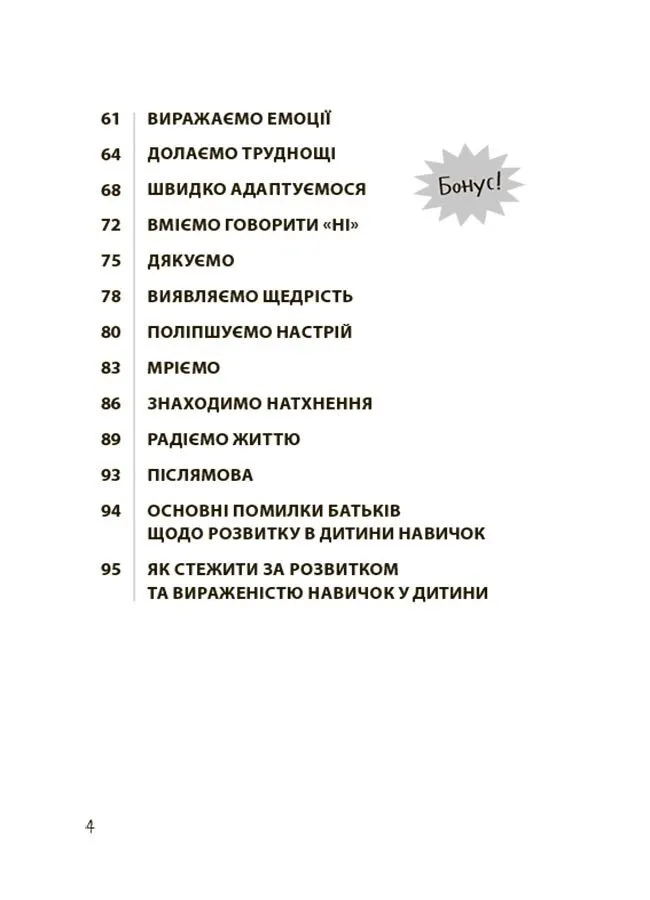 Книга створена на основі концепції спільного виховання. Це означає, що разом із формуванням навичок у дитини, батьки також розвиватимуть особистісні якості в собі. Вона допоможе сформувати у дітей такі цінні якості: