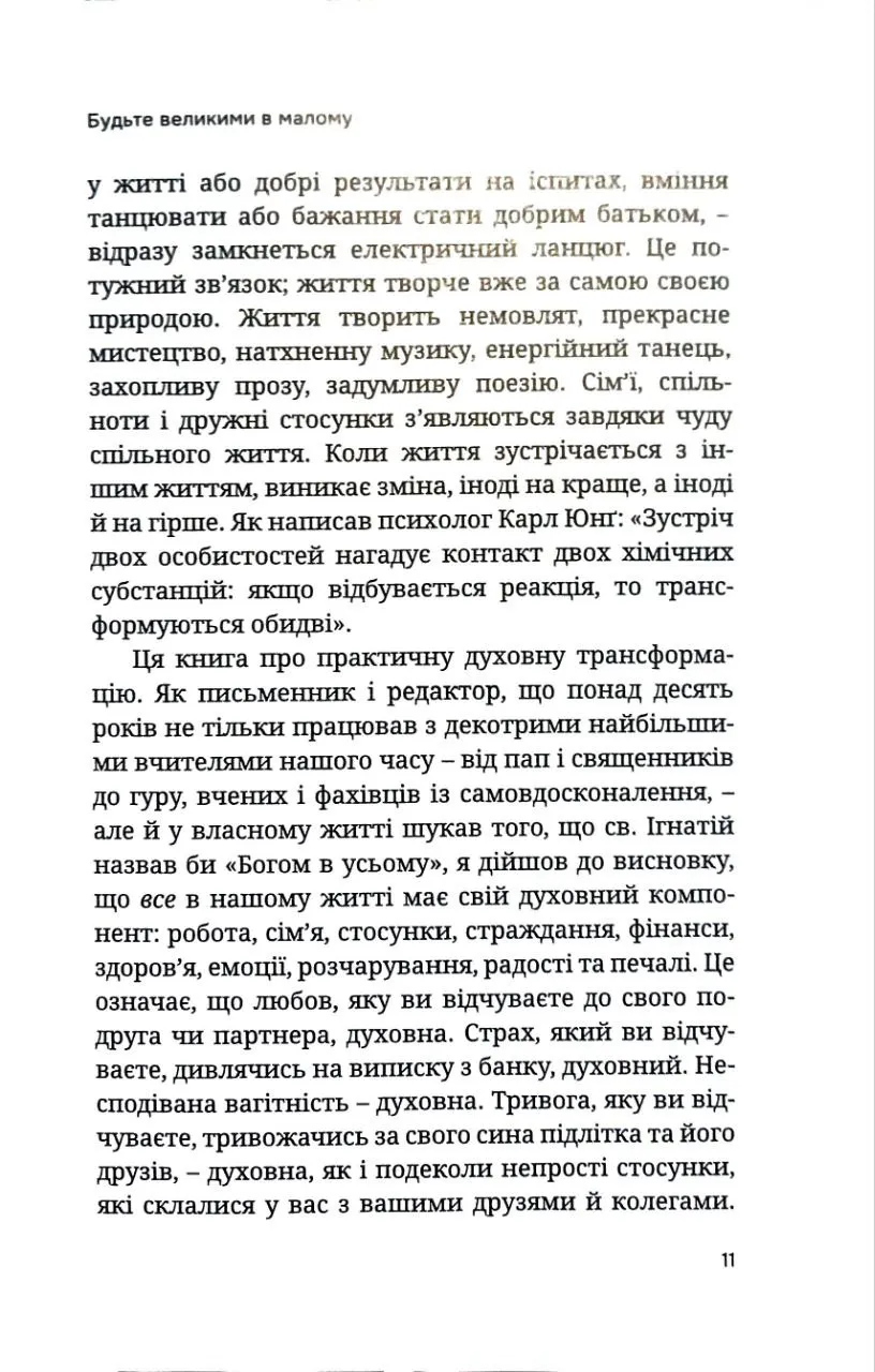Якщо ви думаєте що духовного життя у вас не так багато, щоби влаштувати у ньому генеральне прибирання, автор уже з перших сторінок продемонструє, що воно насправді всюди: у роботі, сім'ї, стосунках, фінансах, стражданнях, радощах та печалях. Ґері Дженсен не закликає змінити все одразу, натомість показує, як роблячи маленькі кроки у напрямку змін, можна досягти чогось, що межує з дивом.