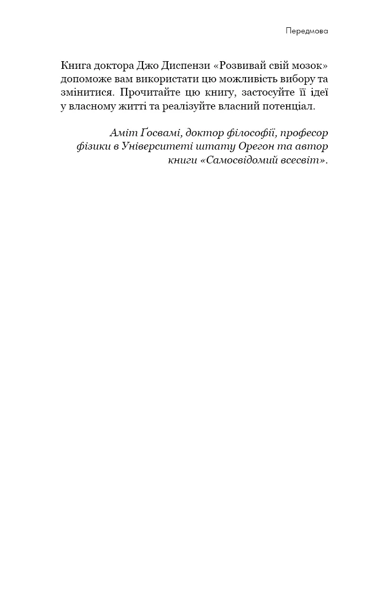 Джо Диспенза — визнаний експерт у галузі нейронаук, хімії мозку й людської свідомості. Він є автором кількох міжнародних бестселерів, виступає з лекціями по всьому світі та допомагає людям будувати життя, засноване на науково обґрунтованому підході до змін.