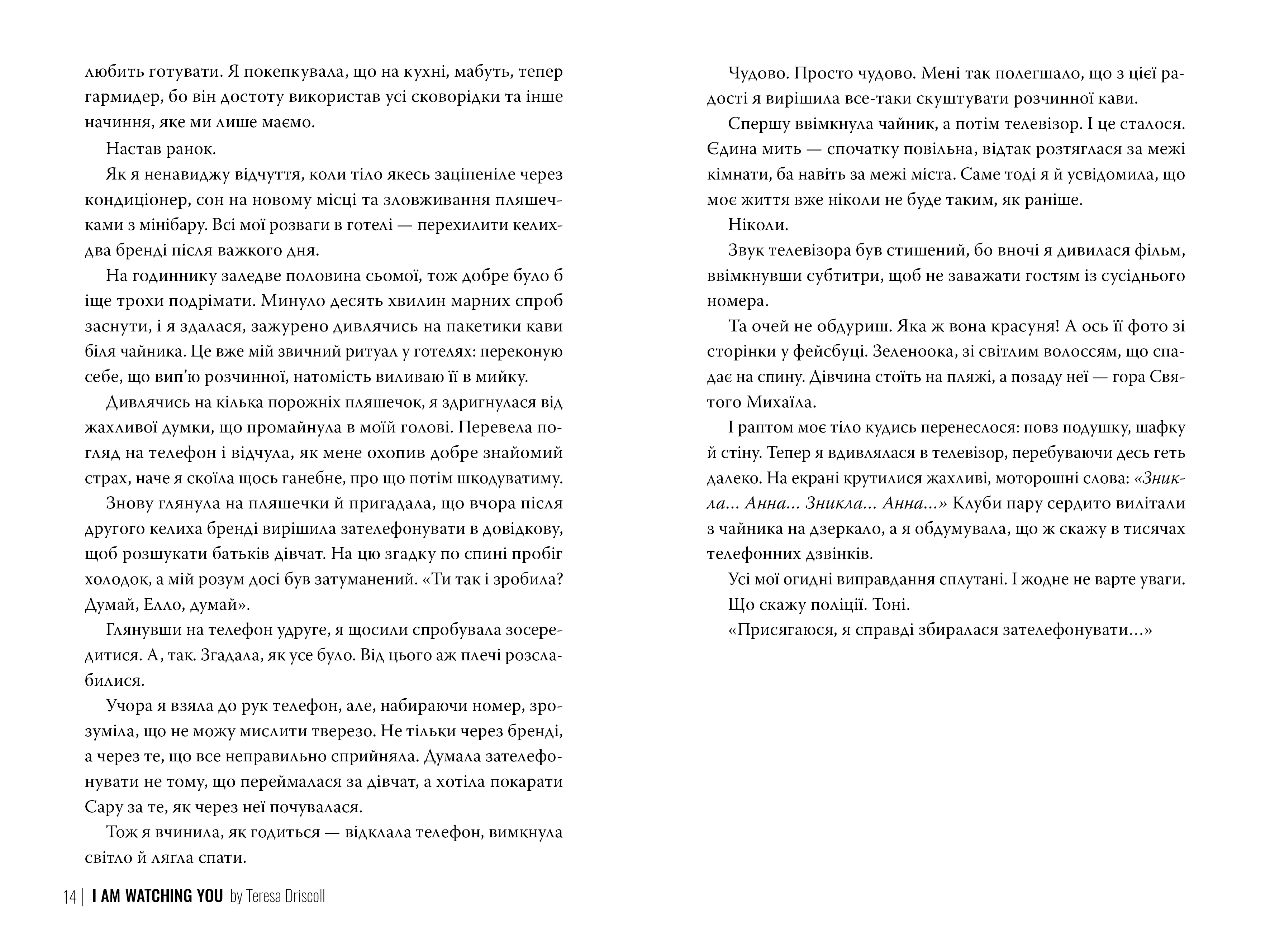 "Я стежу за тобою" — це напружений психологічний трилер, який захоплює з перших сторінок і не відпускає до фіналу. Авторкою книги є відома британська письменниця Тереза Дріскол, яка здобула популярність завдяки своєму гостросюжетному стилю та глибокій психологічній пронизливості. Цей роман став справжнім хітом на міжнародному книжковому ринку, увійшовши до списків бестселерів Amazon і завоювавши численні схвальні відгуки читачів та критиків.
