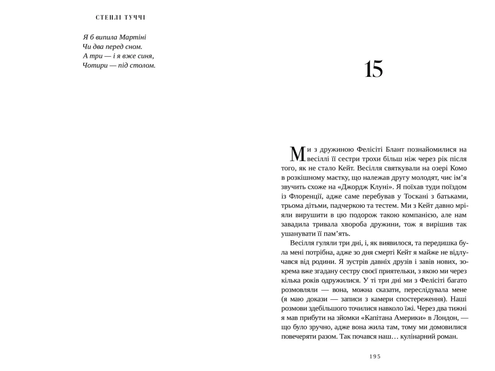 У книзі представлена унікальна комбінація кулінарних розповідей із особистими історіями. Виростаючи в італоамериканській родині в Нью-Йорку, Туччі навчився сприймати їжу не просто як спосіб втамувати голод, а як священний ритуал, сповнений змісту. Від родинних свят до гастрономічних подорожей і сцен з кінофільмів, кожен фрагмент життя автора супроводжується незмінним компонентом — майстерно описаними смачними стравами.