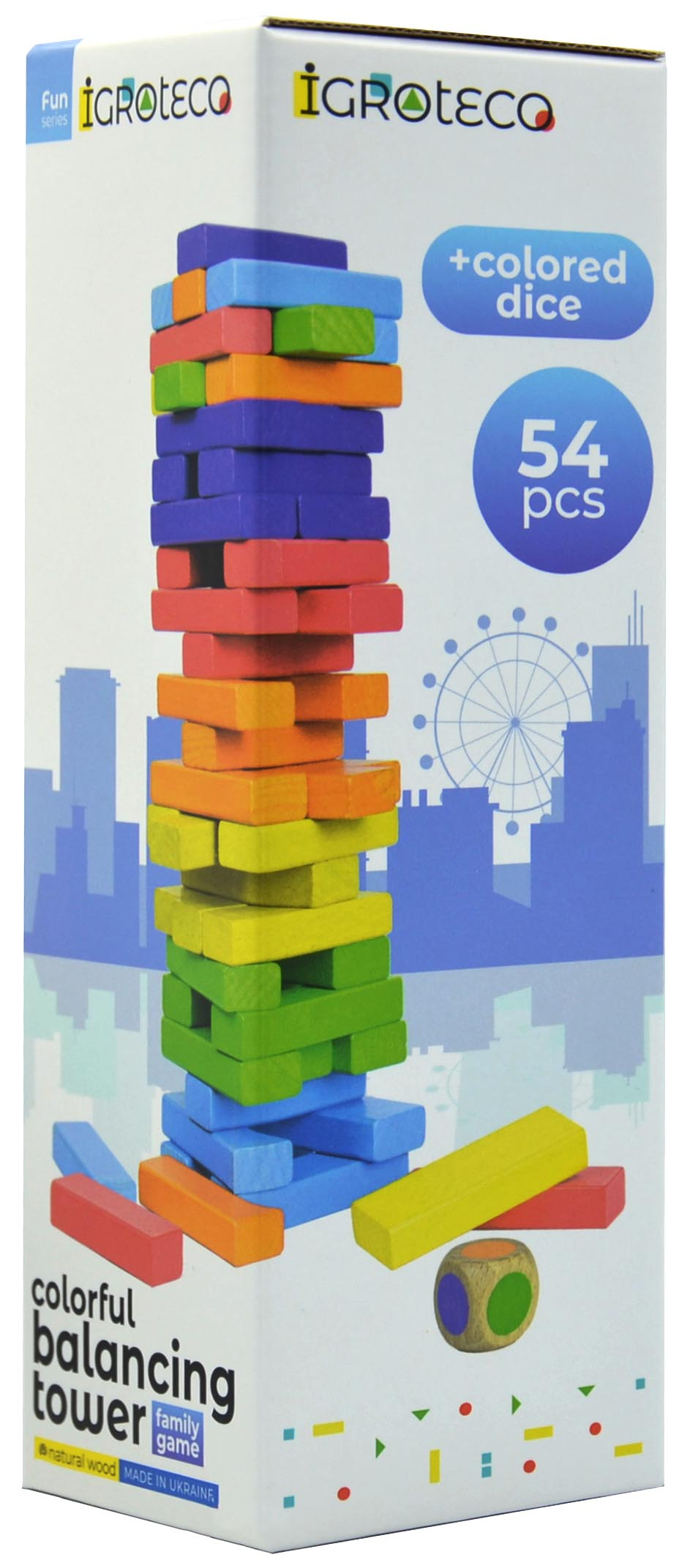 У набір входить набір дерев’яних кольорових блоків та кубик. Всі елементи виготовлені з безпечного, екологічного матеріалу з гладкою поверхнею, що не дряпає руки. Яскраве забарвлення не вицвітає з часом.