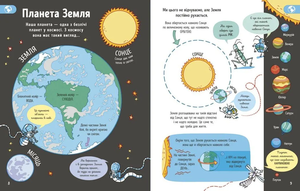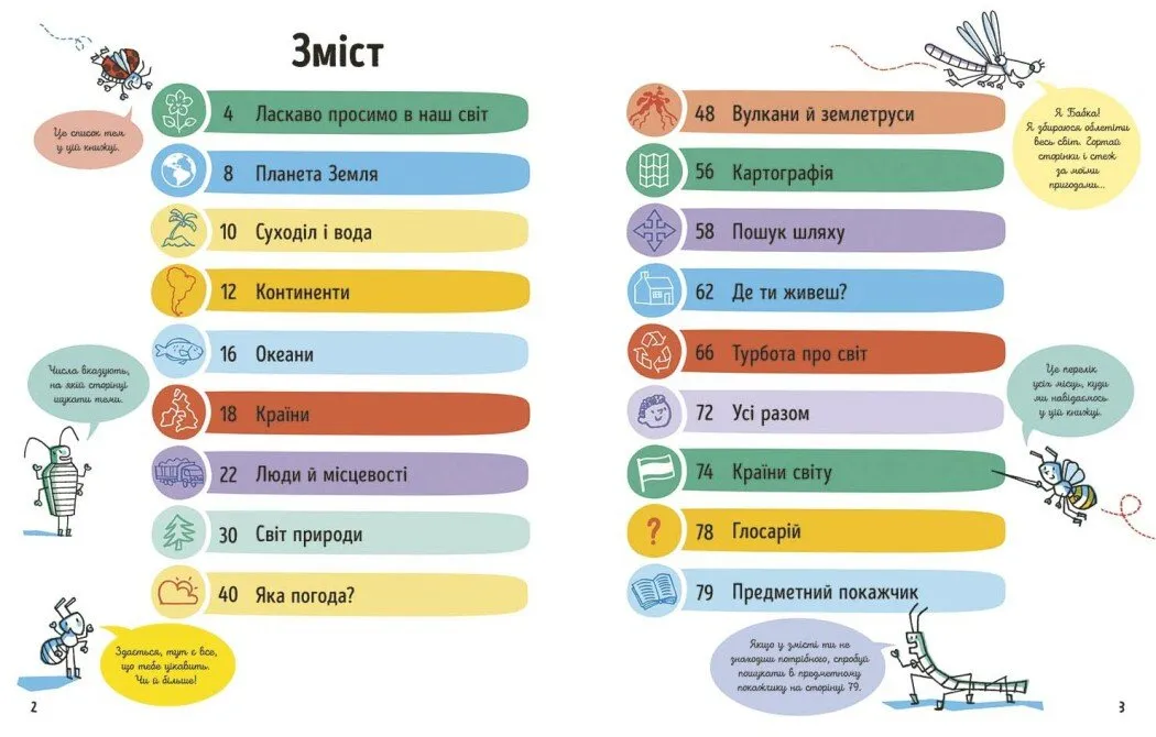 Усе це подано у формі коротких інформаційних блоків, адаптованих під дитяче сприйняття, з інтерактивними запитаннями та яскравими ілюстраціями, які збуджують цікавість і спонукають до подальшого вивчення світу.