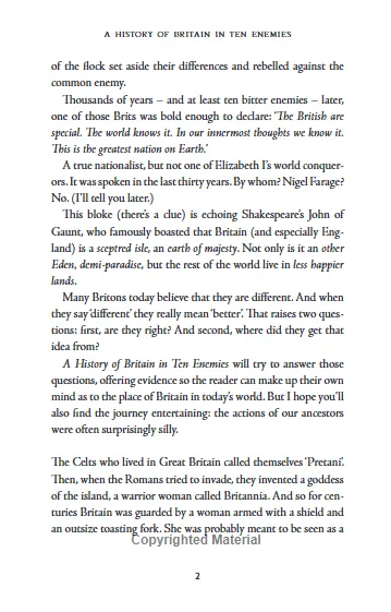 Книга A History of Britain in Ten Enemies відкриває перед читачем новий погляд на історію Великої Британії — не через героїзм та досягнення, а через постаті ворогів, які формували націю. Автор із глибоким знанням та іронією демонструє, як конфлікти визначали сутність британського народу у різні історичні епохи.