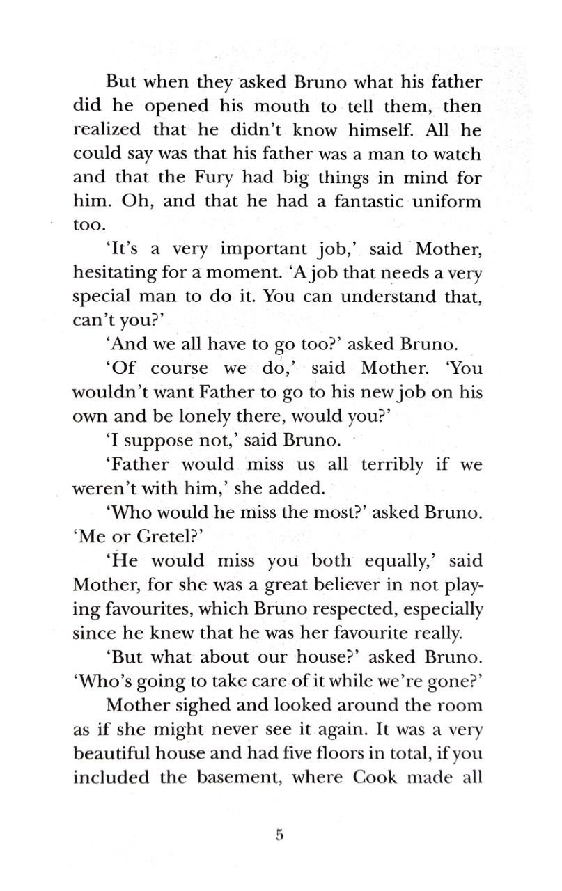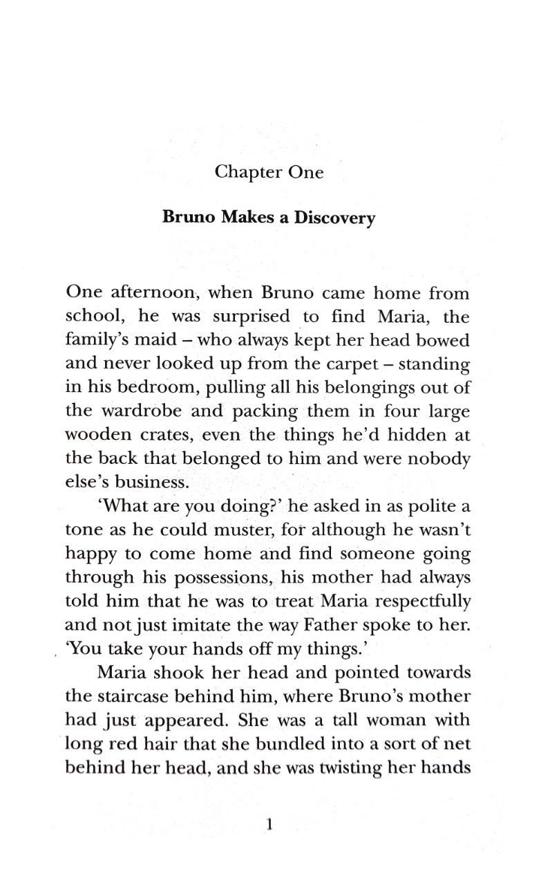 The story follows Bruno, an eight-year-old boy who is forced to move from Berlin to a strange house near a fenced-off compound. Lonely and without friends, Bruno stumbles upon Shmuel — a boy in striped pyjamas living on the other side of the fence. Despite the danger and mystery surrounding Shmuel's world, a secret friendship blossoms between the two boys, forming the emotional core of the novel.