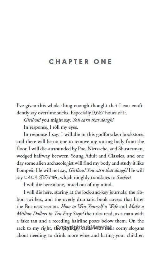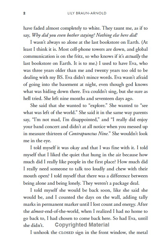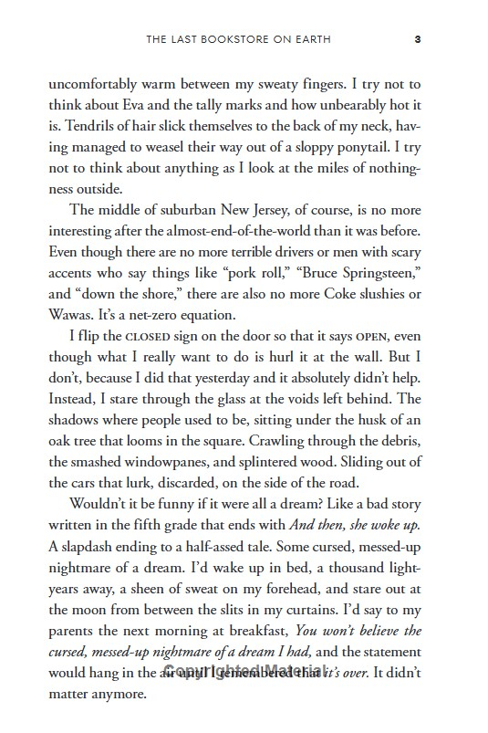 Її переслідують спогади про тих, кого вона не змогла врятувати. Тепер вона ховається в єдиному місці, де колись почувалася в безпеці — у книжковій крамниці, де працювала до катастрофи. Тепер її дні минають у торгівлі книгами за їжу й у зборі історій тих, хто ще вижив.