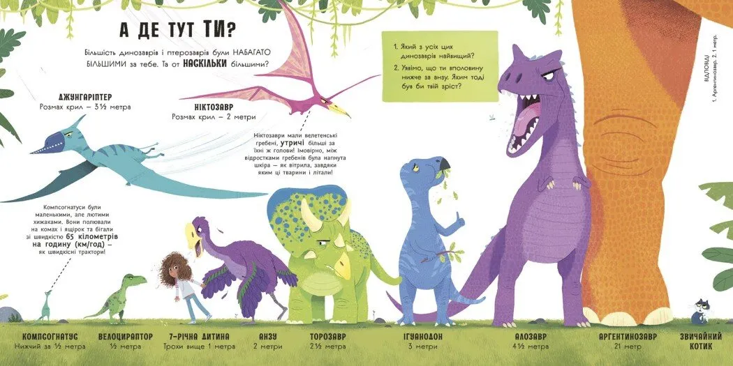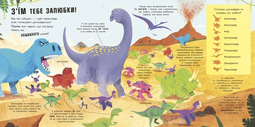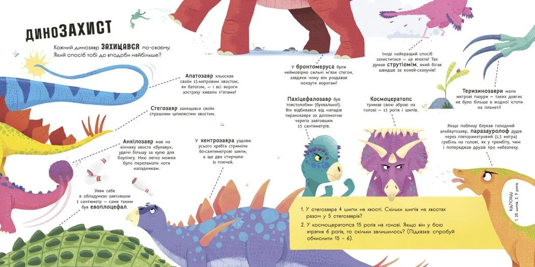 Наприклад, малюк дізнається, як стегозаври захищалися від ворогів, скільки кілограмів рослин міг зʼїдати за день брахіозавр, які динозаври жили в пустелі. Через такі запитання дитина не лише дізнається наукові факти, а й розвиває навички пошуку відповідей, логіки та просторового мислення.