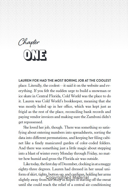 Лорен Фокс — бухгалтерка у Cold World, туристичному атракціоні, де завжди зима, навіть якщо за вікном — волога спека Орландо, Флорида.
