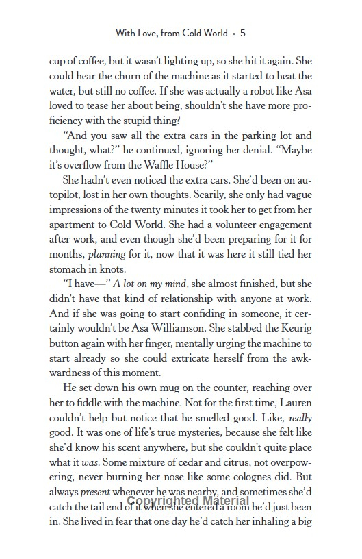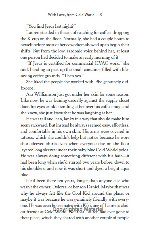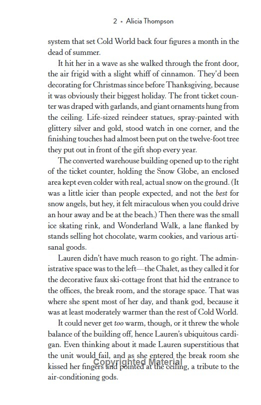 Lauren Fox is the bookkeeper for Cold World, a tourist destination that's always a winter wonderland despite being located in humid Orlando, Florida. Sure, it's ranked way below any of the trademarked amusement parks and maybe foot traffic could be better. But it's a fun place to work, even if 'fun' isn't exactly Lauren's middle name.Her coworker Asa Williamson, on the other hand, is all about finding ways to enliven his days at Cold World - whether that means organizing the Secret Santa or teasing Lauren. When the owner asks Lauren and Asa to propose something (anything, really) to raise more revenue, their rivalry heats up as they compete to come up with the best idea. But the situation is more dire than they thought, and it might take these polar opposites working together to save the day...