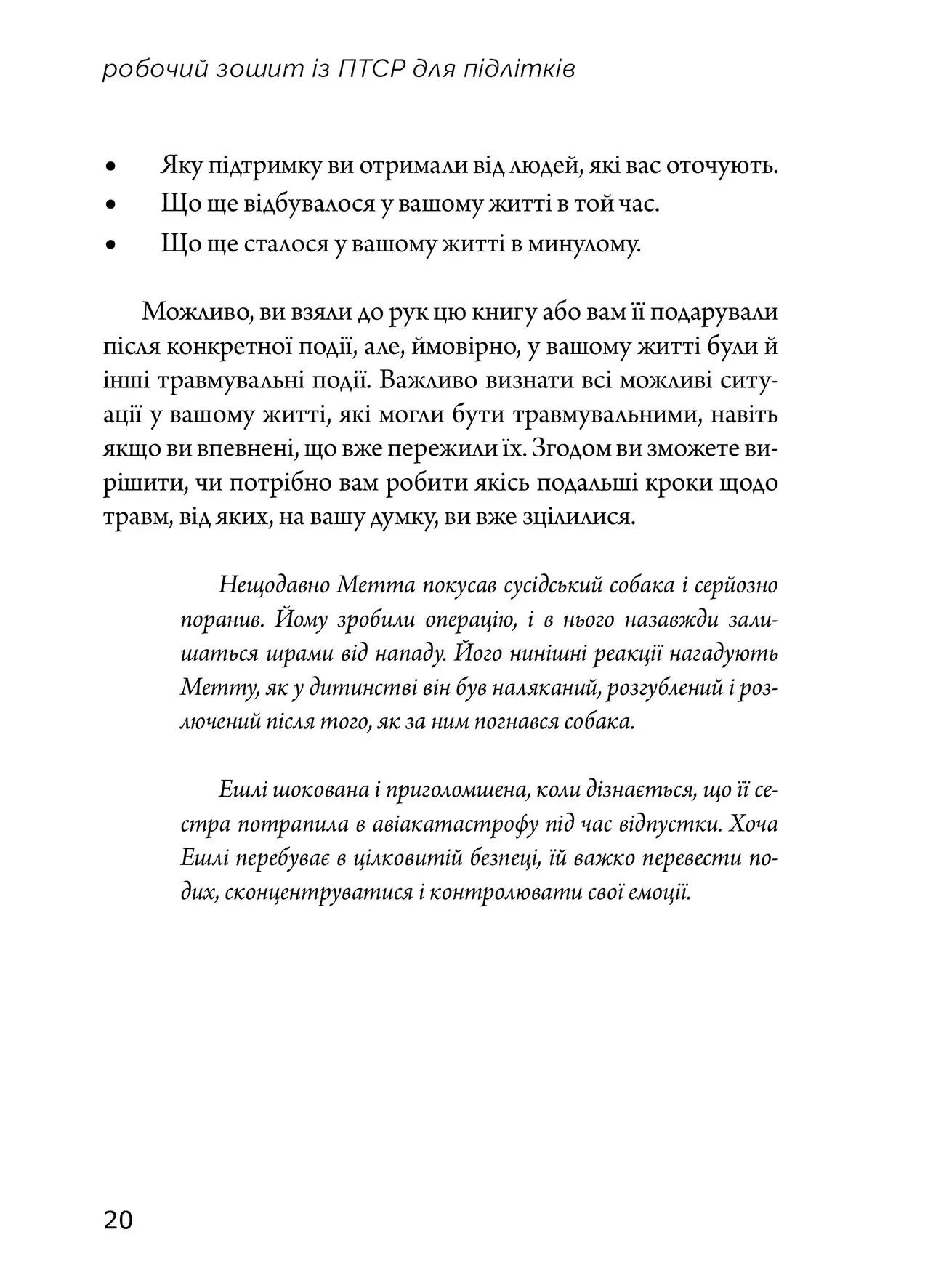 Ця зручна у використанні книга «Робочий зошит із ПТСР для підлітків: прості й ефективні навички для зцілення від травми» від Ліббі Палмер призначена саме для підлітків із посттравматичним стресовим розладом та іншими труднощами, пов’язаними із травмами. Вона заснована на когнітивно-поведінковій терапії і допоможе вам опрацювати свій болісний досвід та осмислити власні думки й почуття. Книга містить робочі аркуші та вправи, які допоможуть вам відновити відчуття безпеки, набути контролю над своїми емоціями, примиритисязі своїм травматичним досвідом і повернути позитивне самовідчуття.