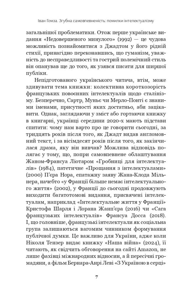 У центрі уваги «Недовершеного минулого» — винятково помітна роль французьких інтелектуалів у європейському культурному та політичному житті після Другої світової війни. Тоні Джадт аналізує найгостріші розколи цієї спільноти: як французькі інтелектуали реагували на обіцянки і зради комунізму, як зберігали відданість радикальним ідеям, зіткнувшись з лицемірством сталінського Радянського Союзу, нових східноєвропейських комуністичних держав і самої Франції.