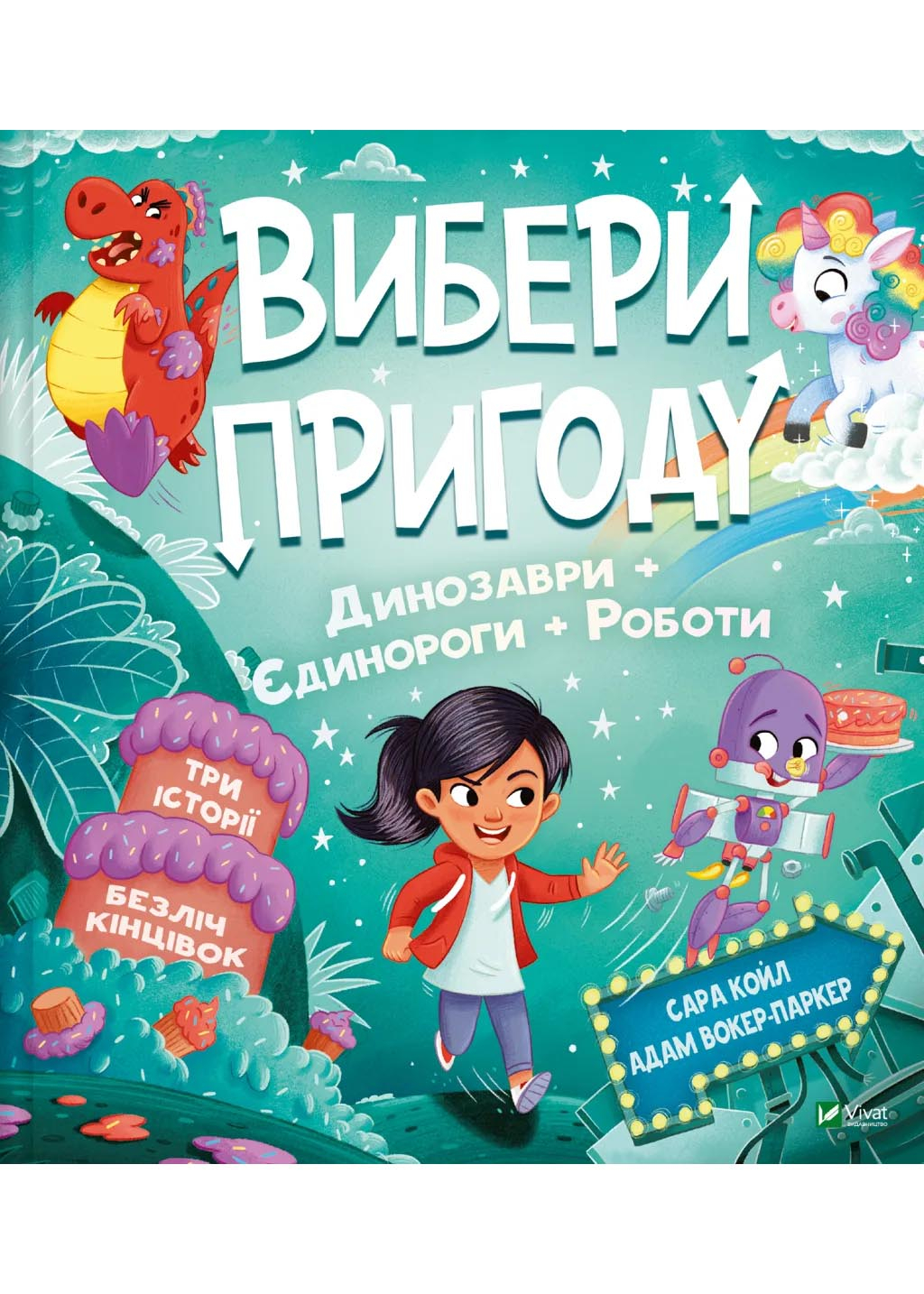 Дитяча книга Вибери пригоду: Пірати + Прибульці + Джунглі / Динозаври + Єдинороги + Роботи — неймовірна інтерактивна подорож, створена авторкою Сарою Койл та ілюстратором Адамом Вокером-Паркером. Це не просто історія, а дві пригоди, кожна з яких має безліч варіантів розвитку. Читачі самі вирішують, яким шляхом піти, чим завершиться сюжет — тож книжка перетворюється на квест-пригоду з вибором сторінок.