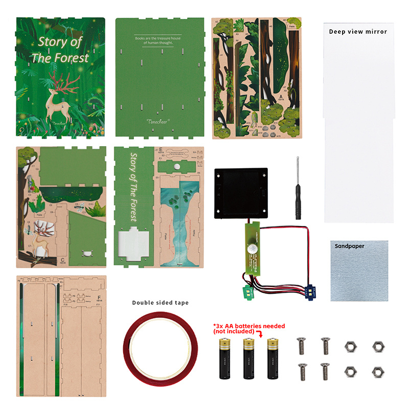 Завдяки високоякісним матеріалам та докладній інструкції зібрати бук нук дуже просто навіть для новачків. Цей набір включає в себе всі необхідні елементи: дерев'яні деталі, декоративні компоненти, освітлення, інструменти. Батарейки та клей не входять у комплект. У фінальному вигляді Story of The Forest створює враження живої сцени прямо з казкового лісу.