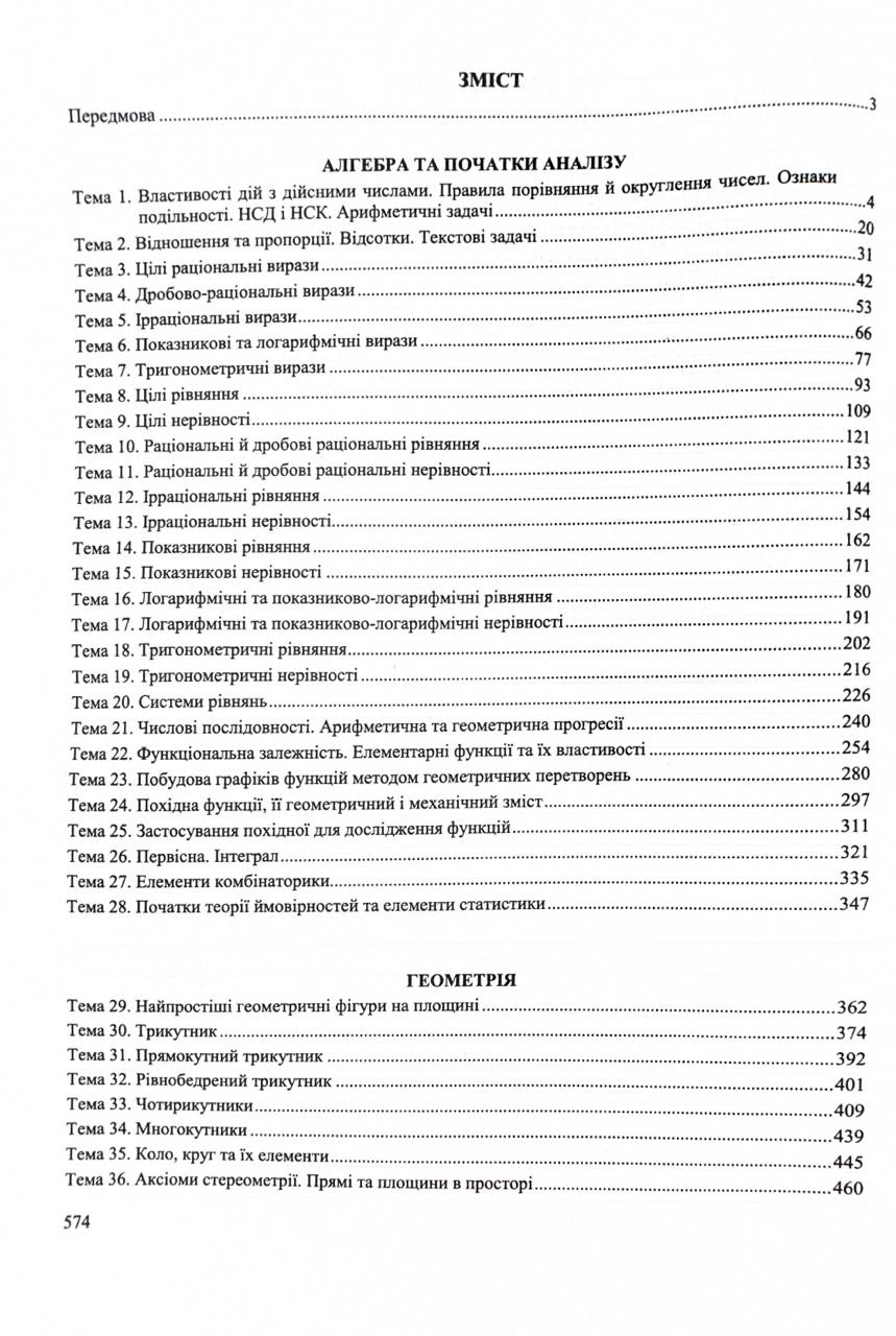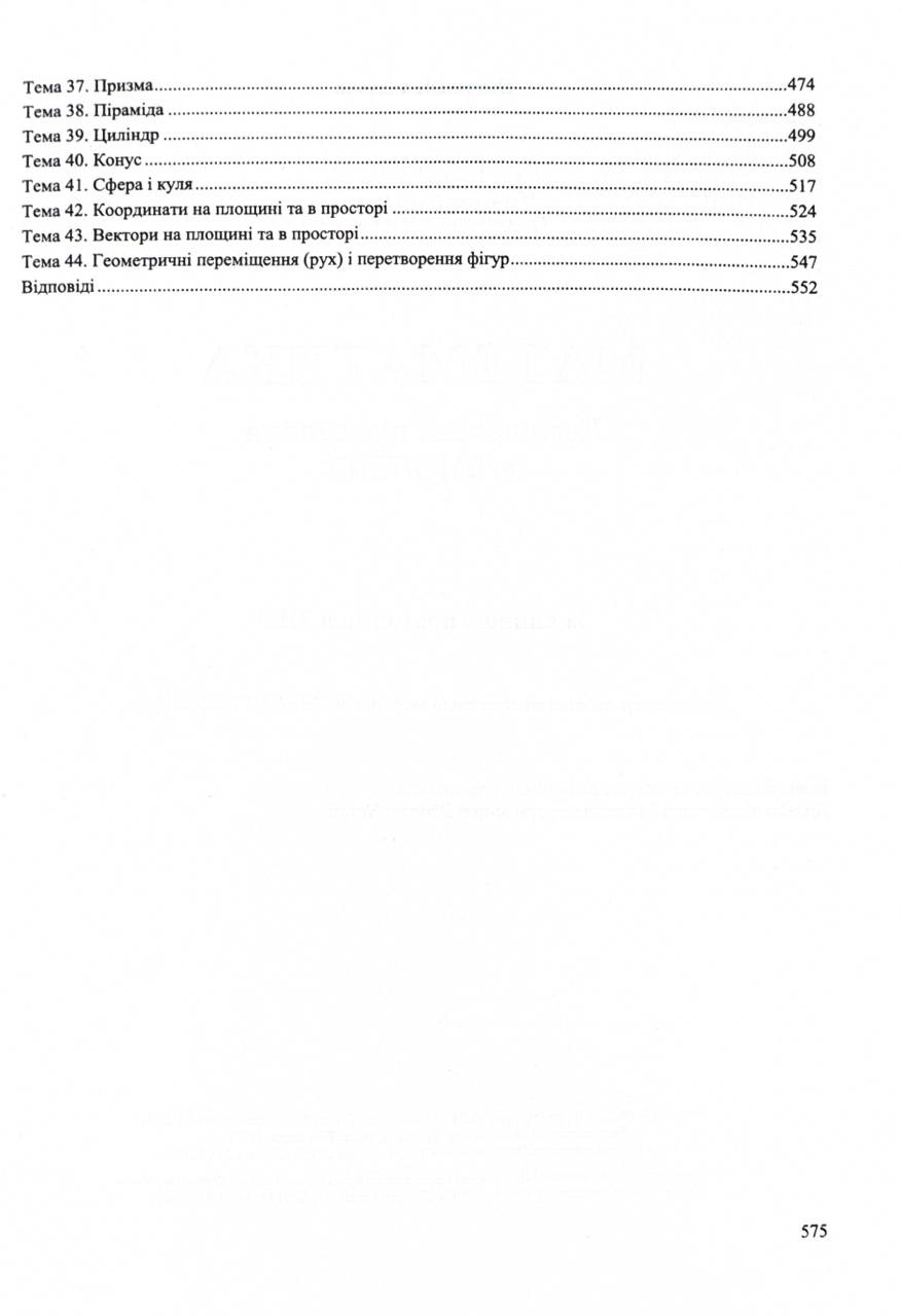 Ця збірка містить систематизований і логічно поданий теоретичний матеріал з алгебри та геометрії. Теорію доповнено численними прикладами з докладними рішеннями, що сприяє глибшому розумінню матеріалу та формуванню навичок розв’язання задач стандартного та підвищеного рівня складності.