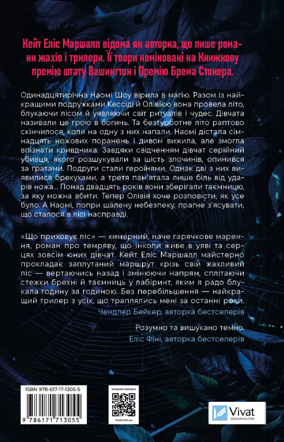 Одинадцятирічна Наомі Шоу вірила в магію. Разом із найкращими подружками Кессіді й Олівією вона провела літо, блукаючи лісом й уявляючи світ ритуалів і чудес. Дівчата називали це грою в богинь. Та безтурботне літо раптово скінчилося, коли на одну з них напали. Наомі дістала сімнадцять ножових поранень і дивом вижила, але змогла впізнати кривдника. Завдяки свідченням дівчат серійний убивця, якого розшукували за шість злочинів, опинився за ґратами. Подруги стали героїнями. Однак дві з них виявилися брехухами, а третя пам’ятала лише біль від ударів ножа… Понад двадцять років вони зберігали таємницю, за яку можна вбити. Тепер Олівія хоче розповісти, як усе було. А Наомі, попри шалену небезпеку, прагне з’ясувати, що сталося в лісі насправді.