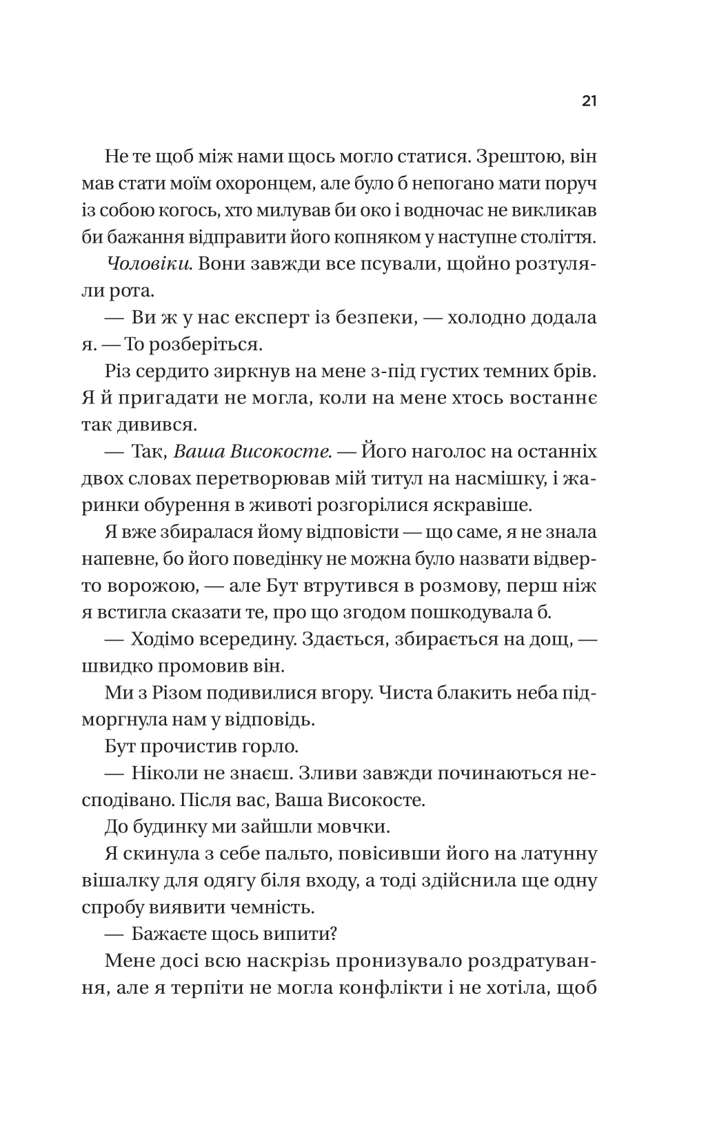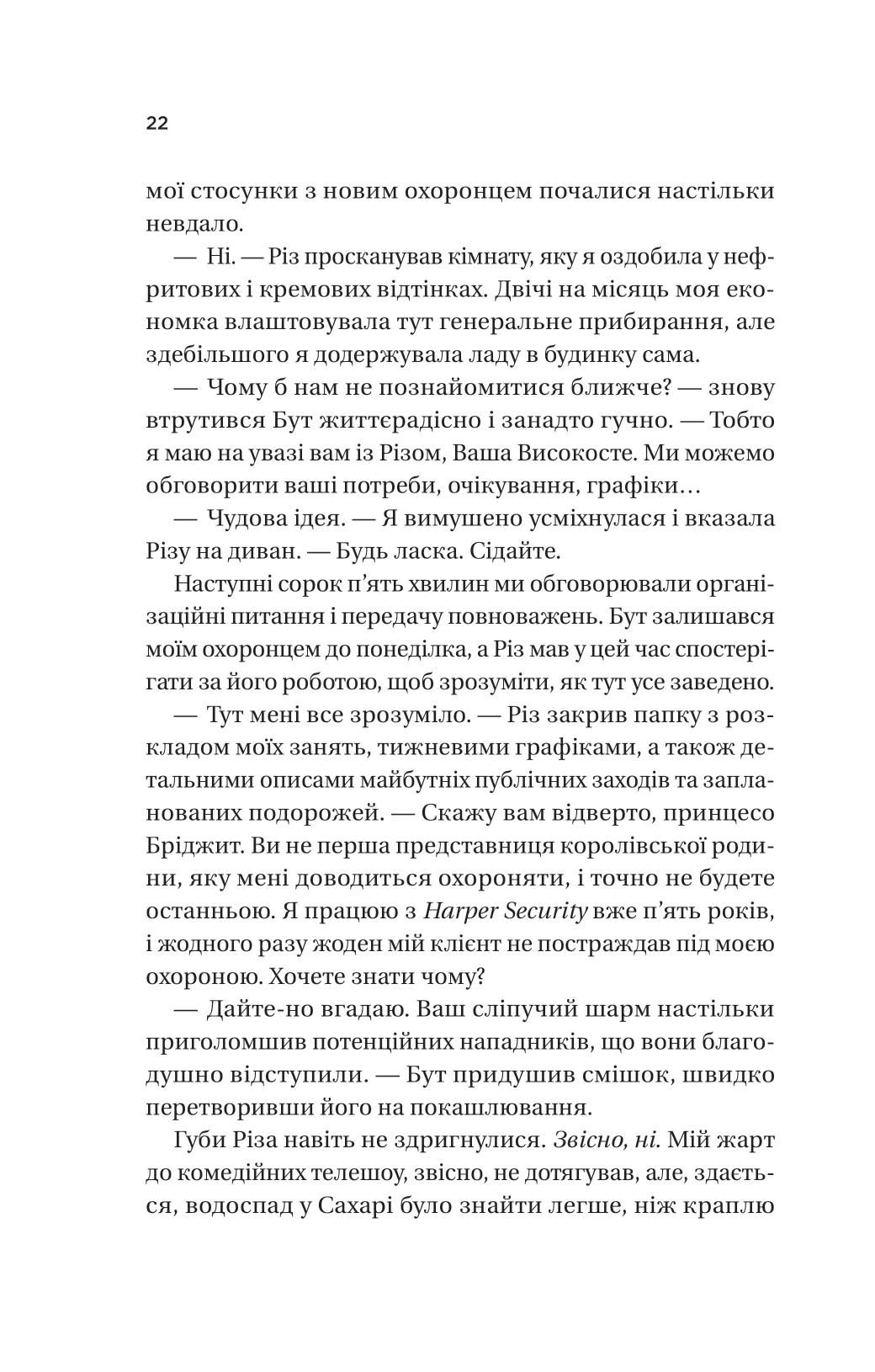 Задумливий і зарозумілий елітний охоронець Різ Ларсен має два правила: захищати своїх клієнтів за всяку ціну й не бути емоційно залученим. Жодного разу він не піддавався спокусі порушити ці правила. До зустрічі з Бріджит фон Ашеберг — скутою кайданами обов’язку принцесою, яка мріє про вільне життя. Принцесою, чиїй упертості можна позаздрити. Принцесою, чий прихований вогонь спопеляє охоронцеві принципи. Різ Ларсен не чекав такого. Поступово Бріджит руйнує Різові захисні мури. Оголюється беззаперечна правда: він не янгол-охоронець для дівчини, а чоловік, який хоче її… знищити. Бо вона — його. Його принцеса. Його заборонений плід. Його найрозпусніша фантазія.