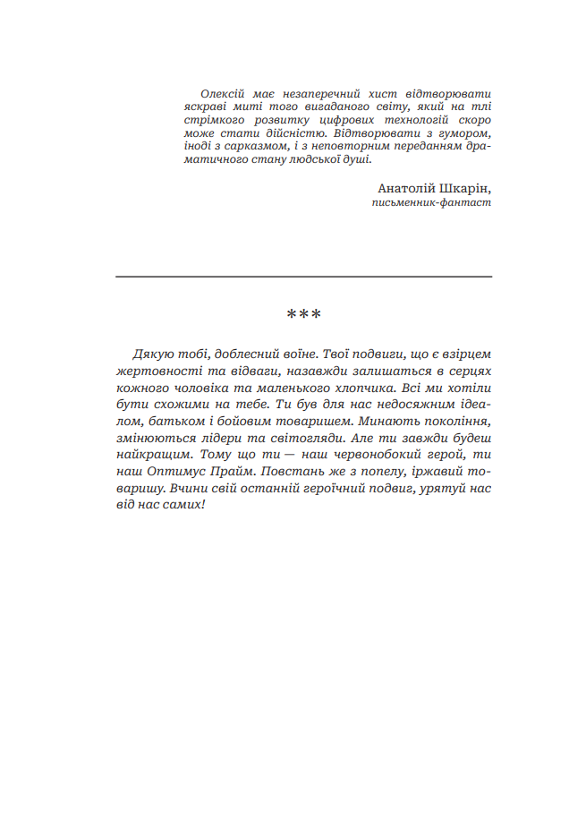Ця книга не залишить байдужими любителів класичної наукової та соціальної фантастики. Автор знову експериментує із сумішшю літературних жанрів, поєднуючи НФ із детективом, горором, патріотичними, філософськими та етнографічними притчами. Й знову окремі історії розповідають нам про ймовірний розвиток людства. Чи зможе воно співіснувати з іншою формою життя? Чи не замала наша планета для двох розумних видів, які не хочуть ні в чому поступатися один одному?