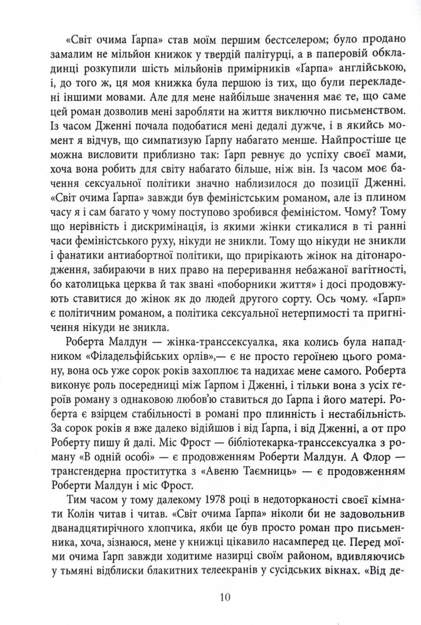Світ очима Ґарпа — одна з найвідоміших книг Джона Ірвінга, авторитетного американського письменника, чиї твори поєднують глибину психологізму, сарказм і філософський погляд на життя. Цей роман став справжнім проривом у літературі та зробив Ірвінга культовим автором 1980-х.
